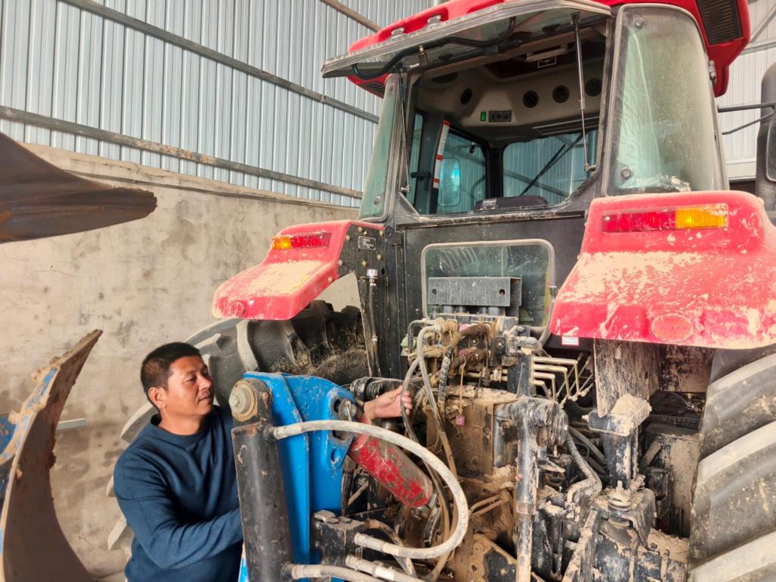 3月26日,在山西省运城市万荣县荣河镇,丁全伟在检修农机。新华社记者 王皓 摄