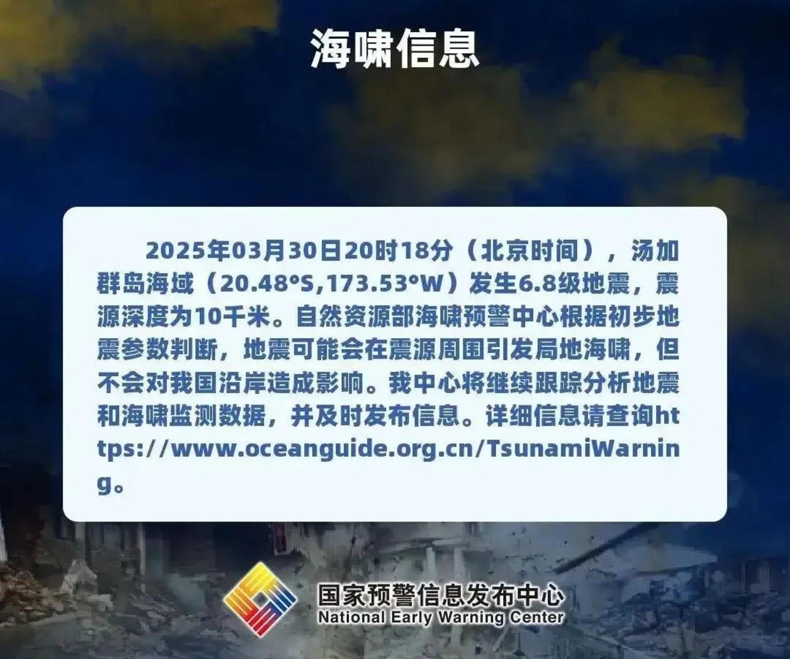 自然资源部海啸预警中心根据初步地震参数判断,地震可能会在震源周围引发局地海啸,但不会对我国沿岸造成影响。目前,美国海啸预警中心已经解除汤加海啸警报。