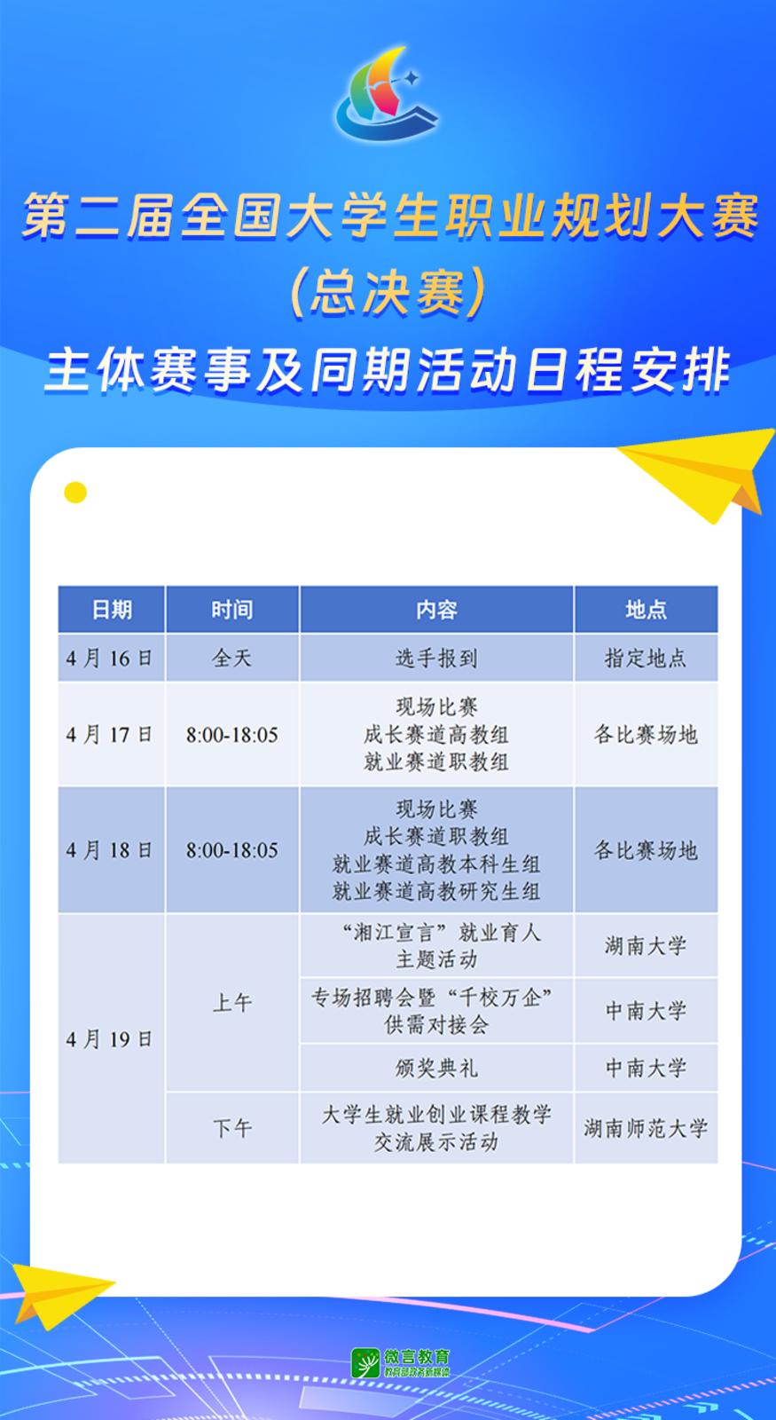 第二届全国大学生职业规划大赛总决赛将于4月16日至19日在湖南省长沙市举办。主体赛事及同期活动日程安排如下: