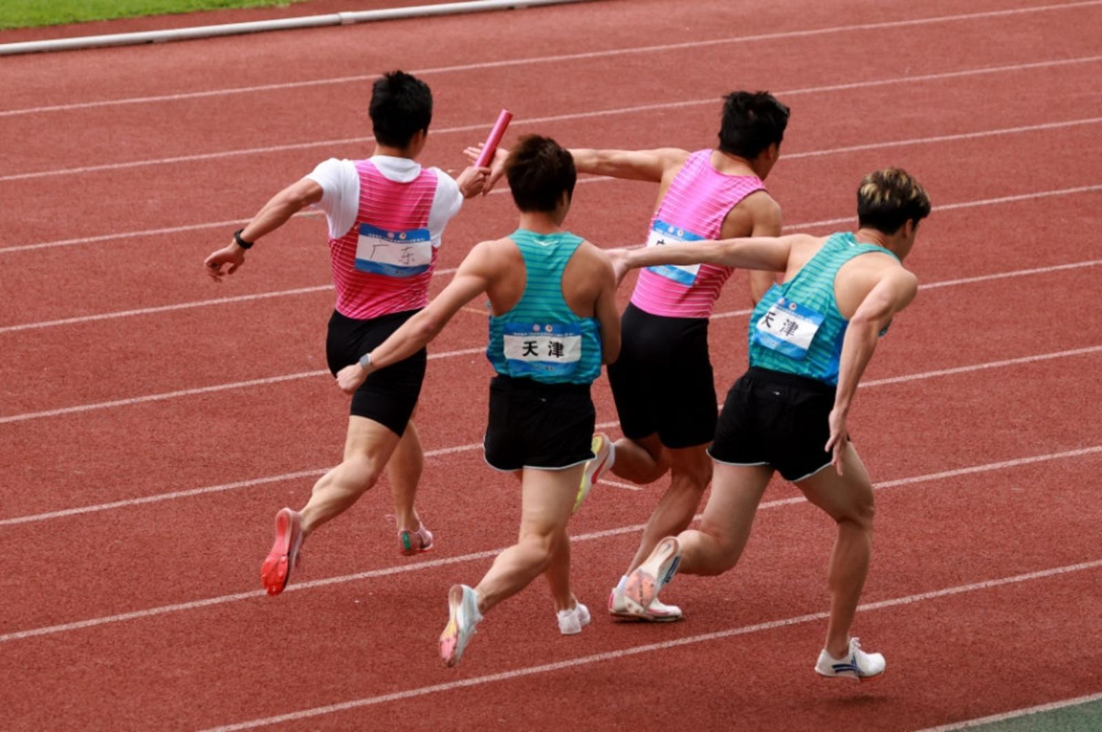 4月13日,苏炳添(左一)与刘洪熙(右二)在比赛中交接棒。新华社发(刘春林摄)