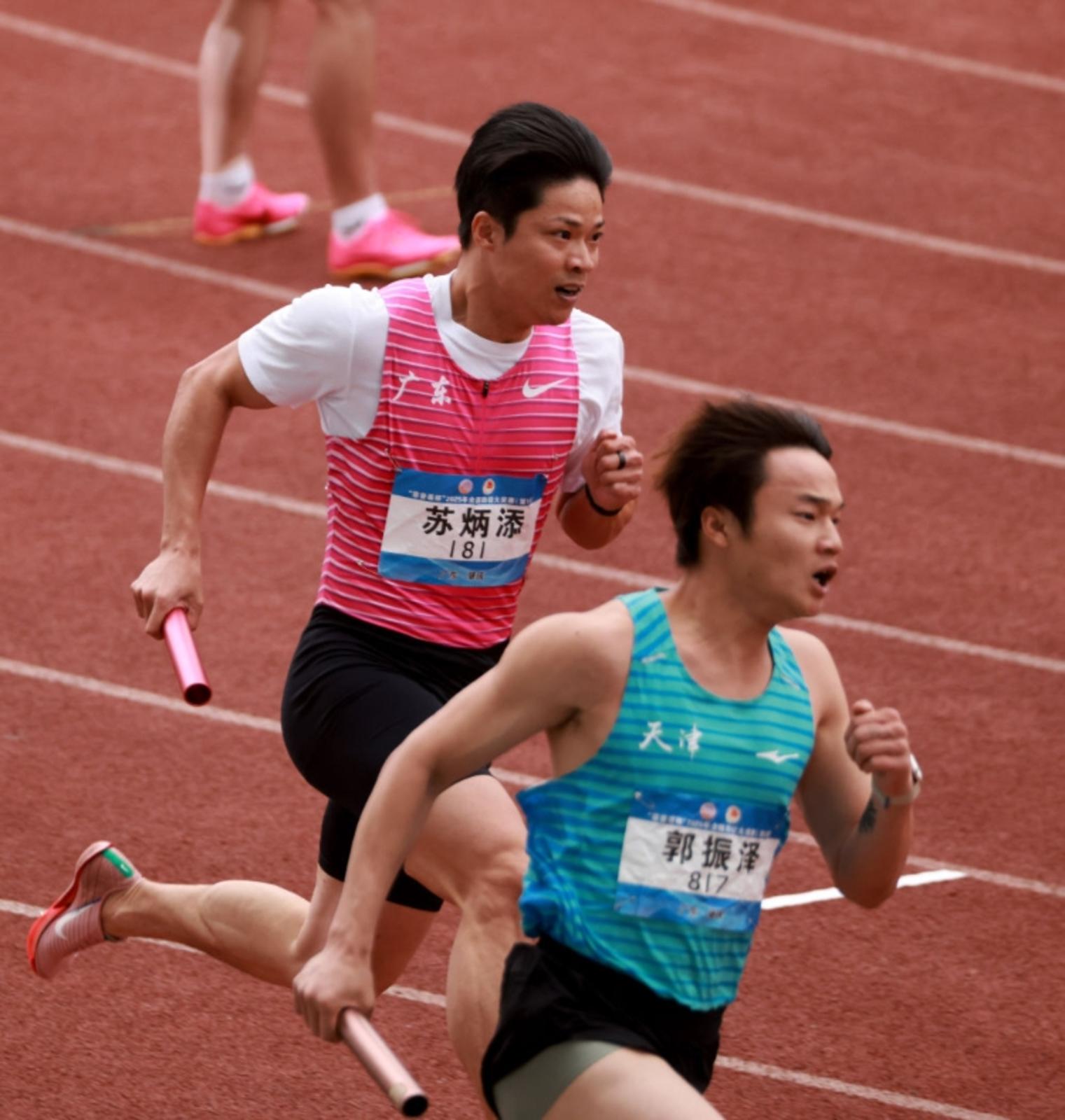 很多人悬着的心放下了。13日,在2025年全国田径大奖赛肇庆站男子4×100米接力决赛中,苏炳添和队友一起跑出39秒25的成绩,夺得冠军。