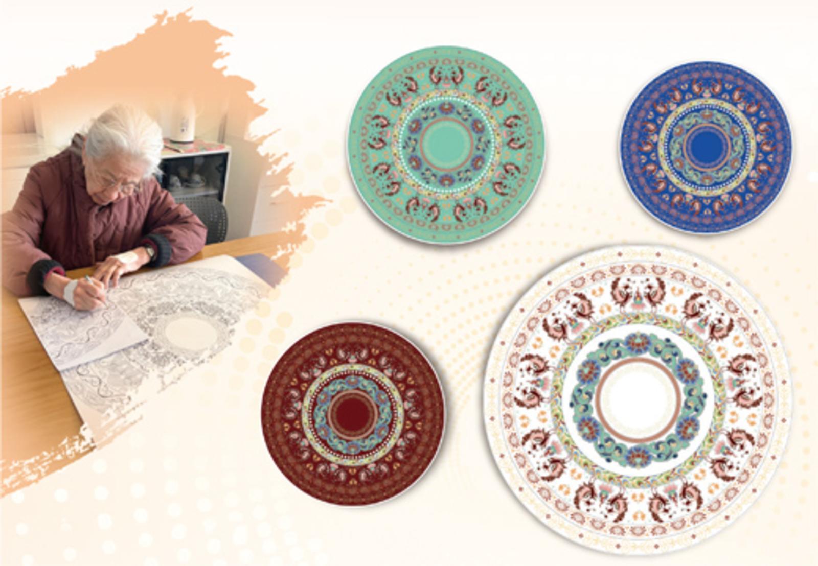 这个展项由94岁的著名工艺美术家常沙娜领衔创作,影像由中影(北京)电影制片厂有限公司制作。影像以4幅敦煌纹样图开篇。“一共制作了龙凤两个版本,每一版都包含石青、石绿、红、白4个颜色。敦煌宝相花、莲花、龙凤等元素均取自我临摹的敦煌纹样,都是象征吉祥、繁荣的纹样。”常沙娜介绍,“凤鸟取自五代428窟,寓意吉祥的祝愿;牡丹缠枝纹,代表繁荣、吉祥之意;石榴卷草纹,传达了吉祥和丰富美好的寓意;双龙吐珠纹样也寓意吉祥喜庆;龙凤纹样图案组合成和谐的圆盘,有龙凤呈祥之意。”