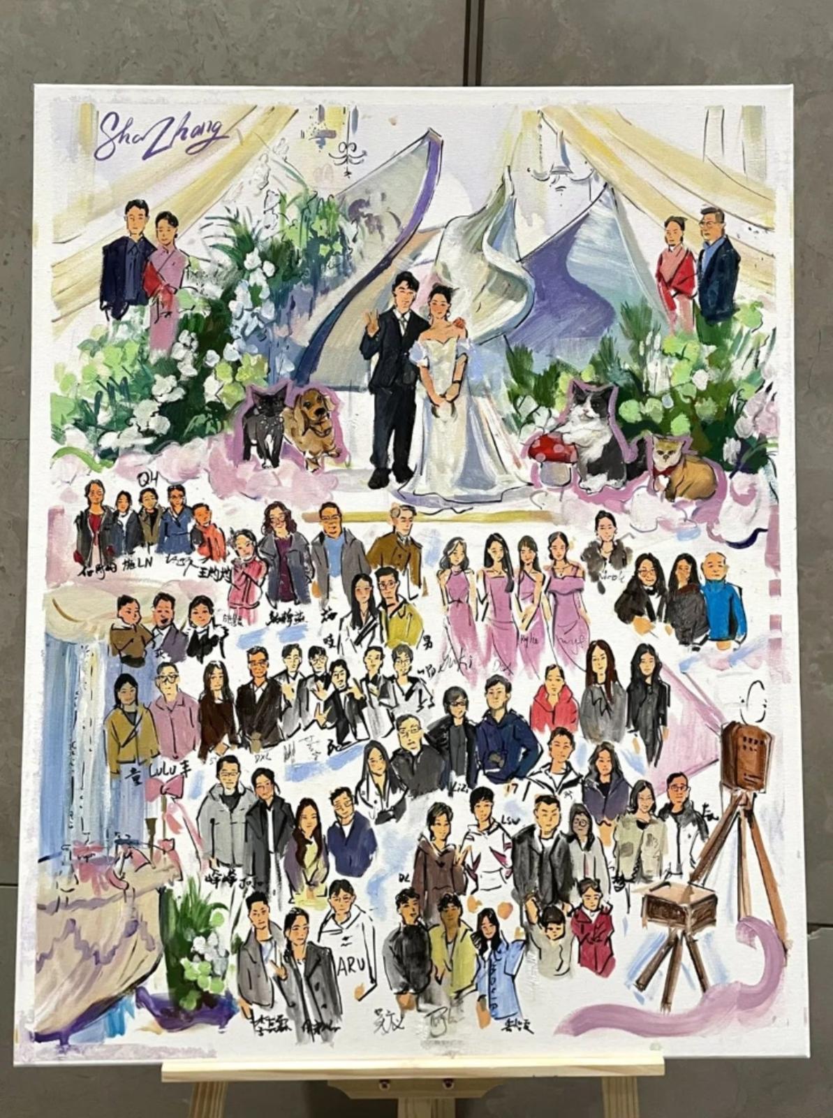 那场婚礼上,小冯细细观察并画出了新人60多位亲友的微小表情,还让每个人都签上了自己的名字。“这幅画带给我的感动远远溢出画框之外,时隔一月再回头去看,仿佛置身婚礼当天。”当天的新娘这样描述她对小冯的认可。