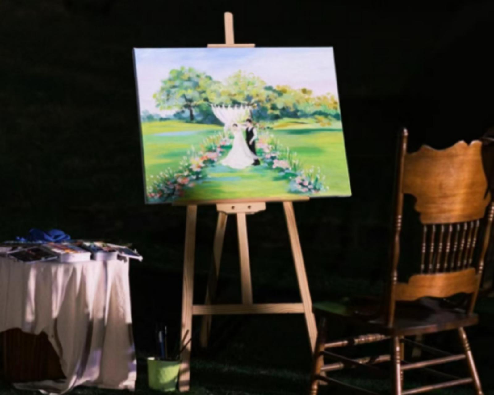“完成一幅油画需要4-6个小时,而成品一般要当天交付给新人,所以现场绘画时间非常有限。早到场地可以提前观察现场的静物陈设,有能画的背景可以先准备起来,这也是一个婚礼绘画师最基本的职业素养。”