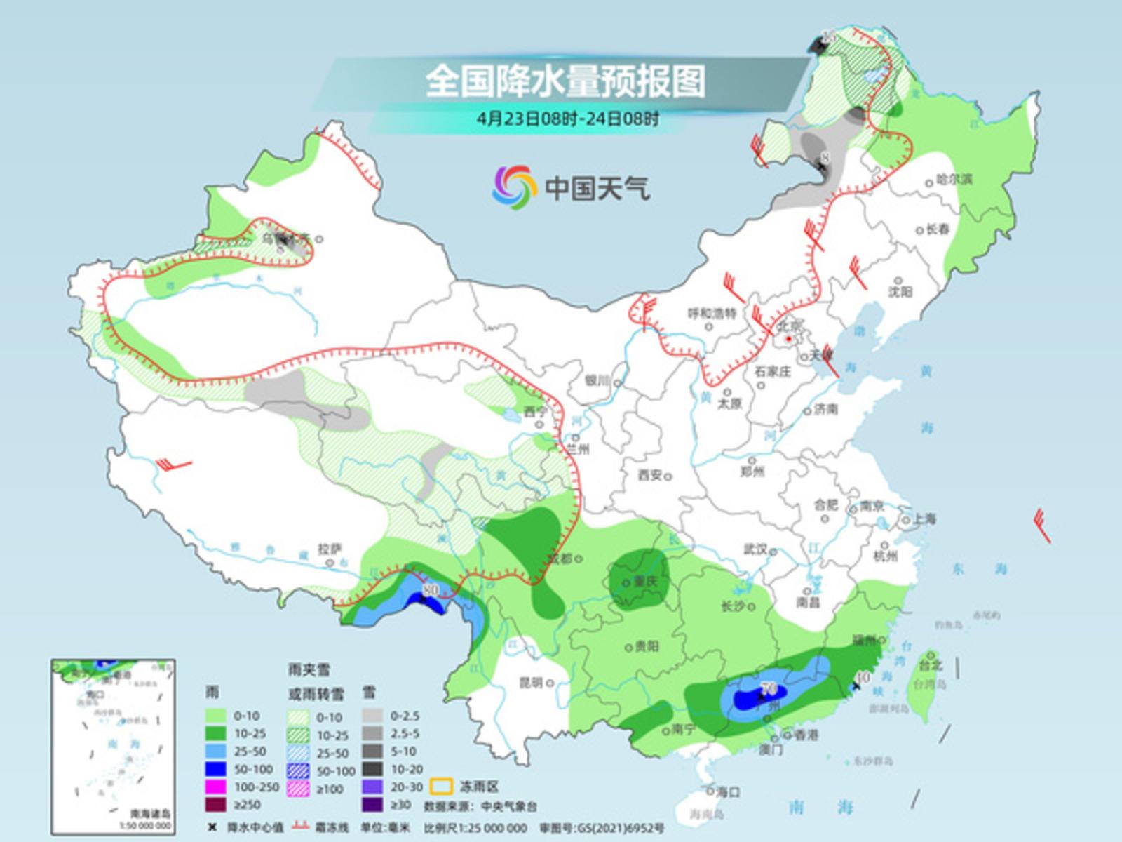 后天,新疆沿天山地区和南疆山区、西藏北部、青海东部和南部、川西高原北部等地部分地区有小雪或雨夹雪,局地有中到大雪。福建中南部、广东大部、广西东部、四川盆地西北部、西藏东南部等地部分地区有中到大雨,其中,广东中东部等地部分地区有暴雨。