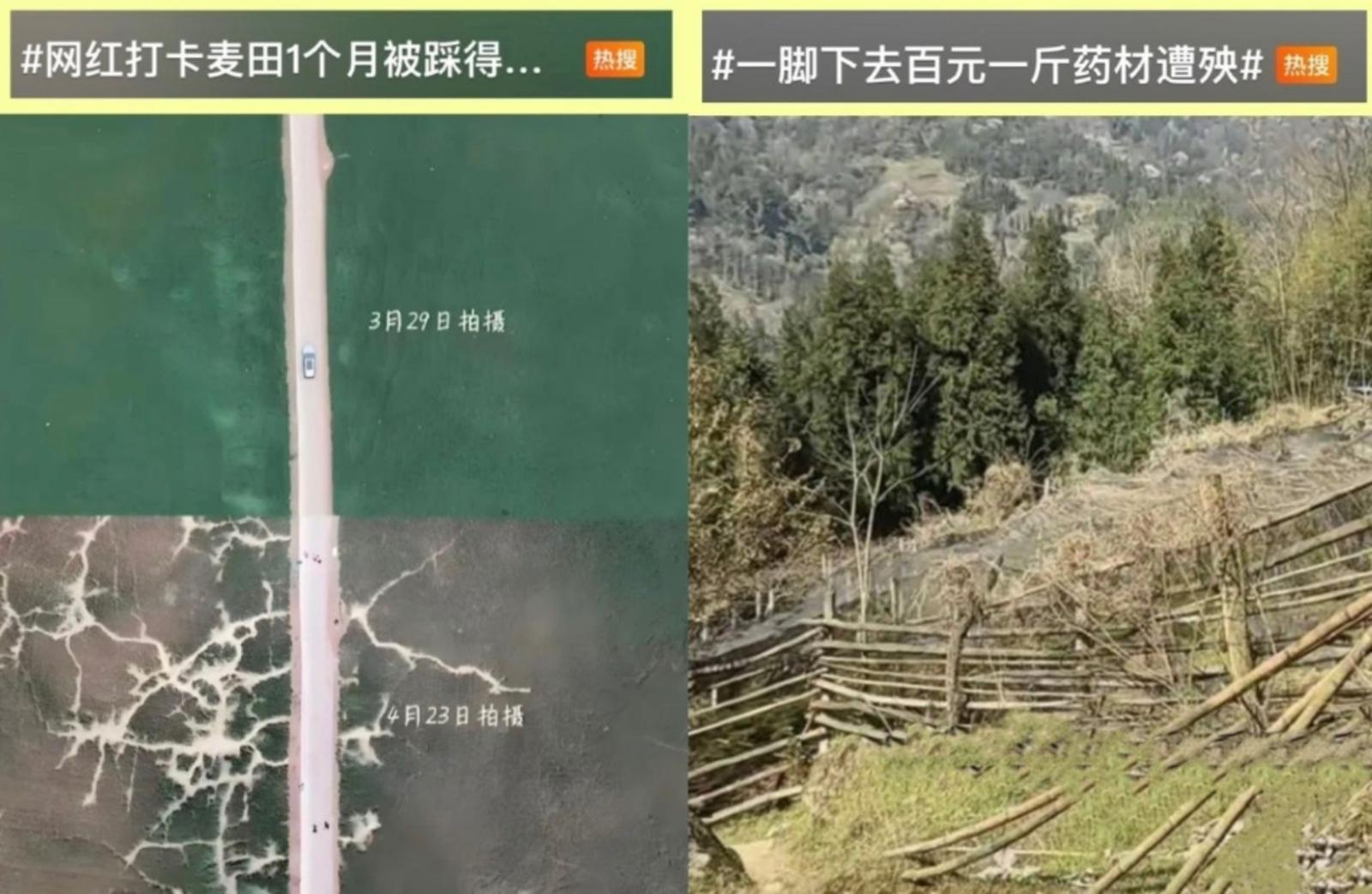航拍对比麦田出现明显踩踏痕迹/带有围栏的药材种植区域被游客翻越