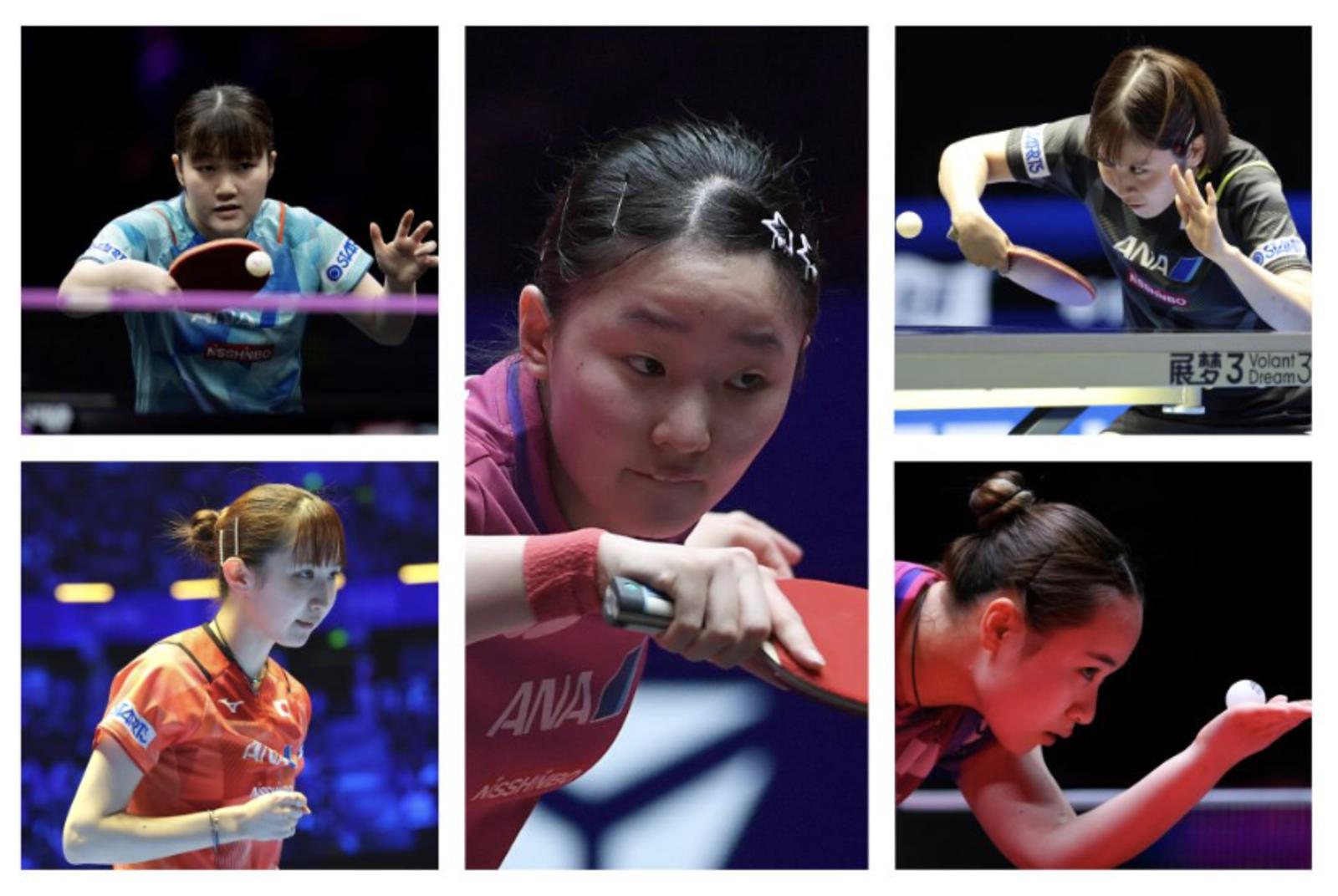 日本女队阵容:大藤沙月(左上)、早田希娜(左下)、张本美和(中)、平野美宇(右上)和伊藤美诚(右下)