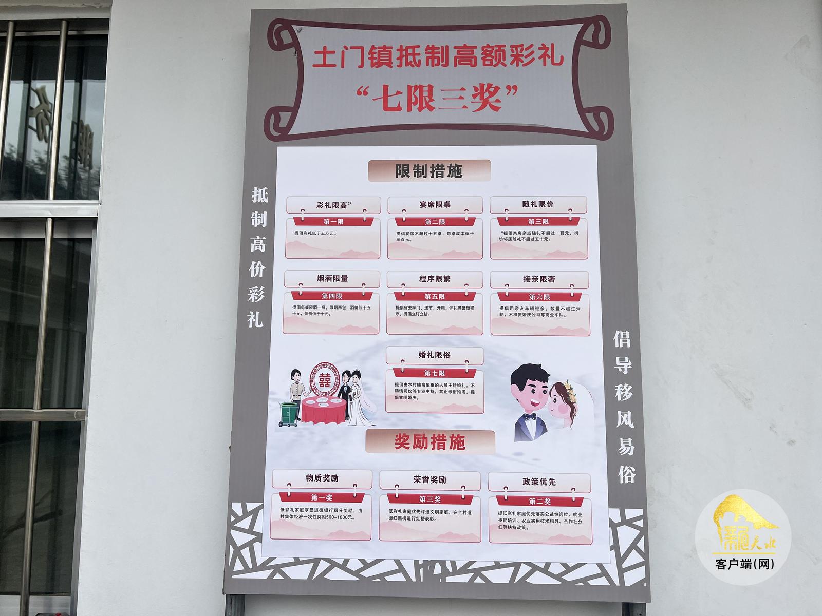 土门镇创新推行“一约两会三书”制度,配套道德银行积分制和抵制高额彩礼“七限三奖”措施。“七限”即彩礼限高、宴席限桌、随礼限价、烟酒限量、程序限繁、接亲限奢、婚礼限俗;“三奖”则对简办家庭给予道德积分、村集体经济500元至1000元奖励、优先落实培训分红政策及文明家庭评选红榜表彰。“精神激励+物质鼓励”让文明新风持续升温。
