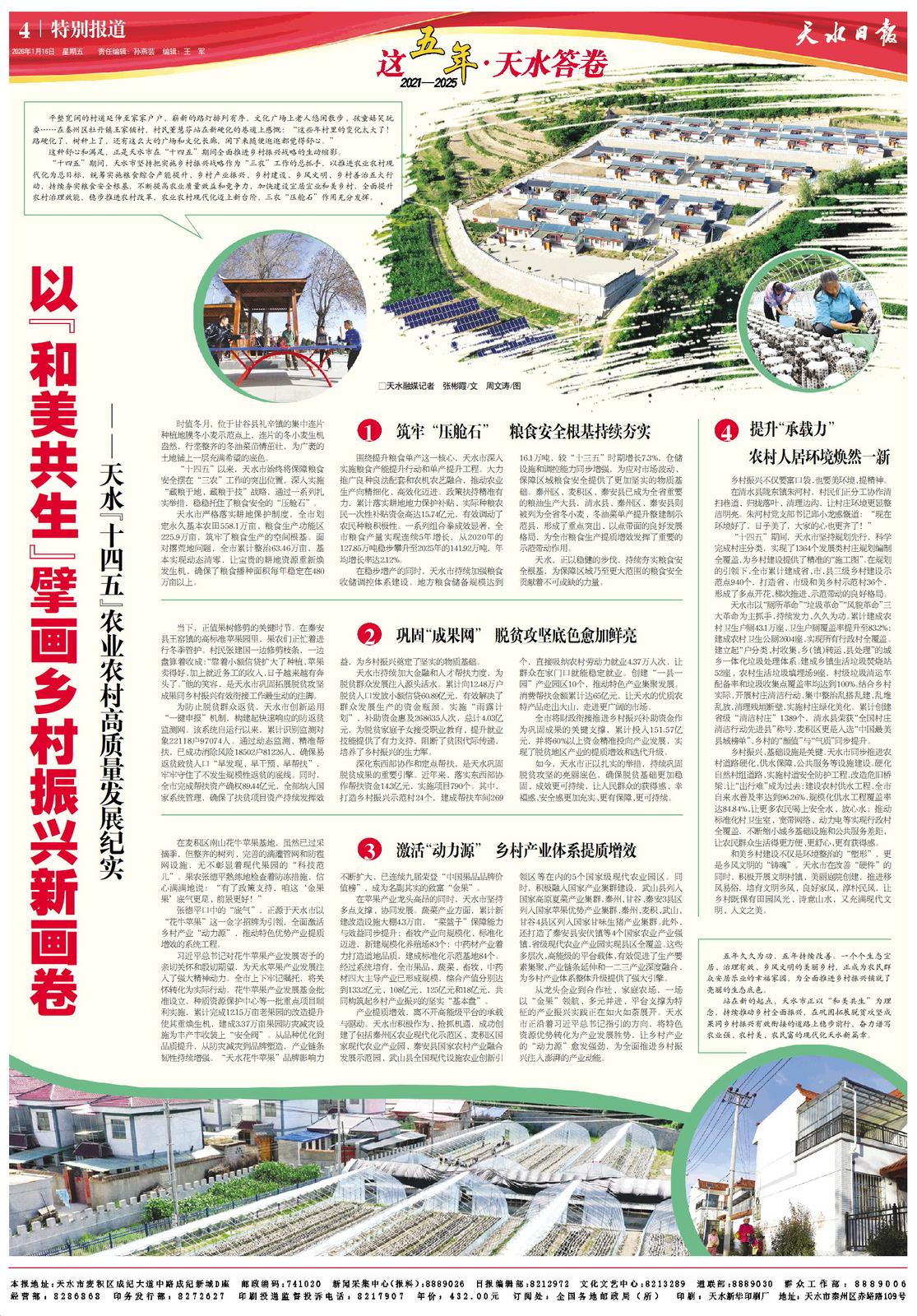 “十四五”期间,天水市坚持把实施乡村振兴战略作为“三农”工作的总抓手,以推进农业农村现代化为总目标,统筹实施粮食综合产能提升、乡村产业振兴、乡村建设、乡风文明、乡村善治五大行动,通过持续夯实粮食安全根基,不断提高农业质量效益和竞争力,加快建设宜居宜业和美乡村,全面提升农村治理效能,稳步推进农村改革,农业农村现代化迈上新台阶,三农“压舱石”作用充分发挥。