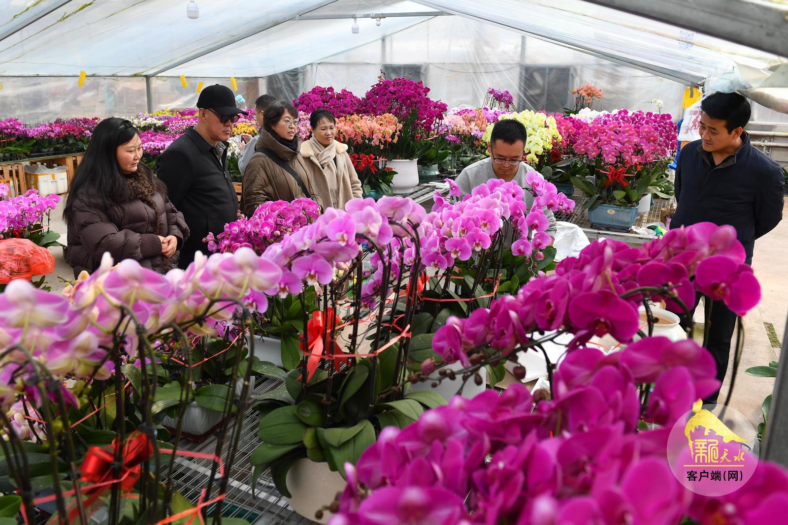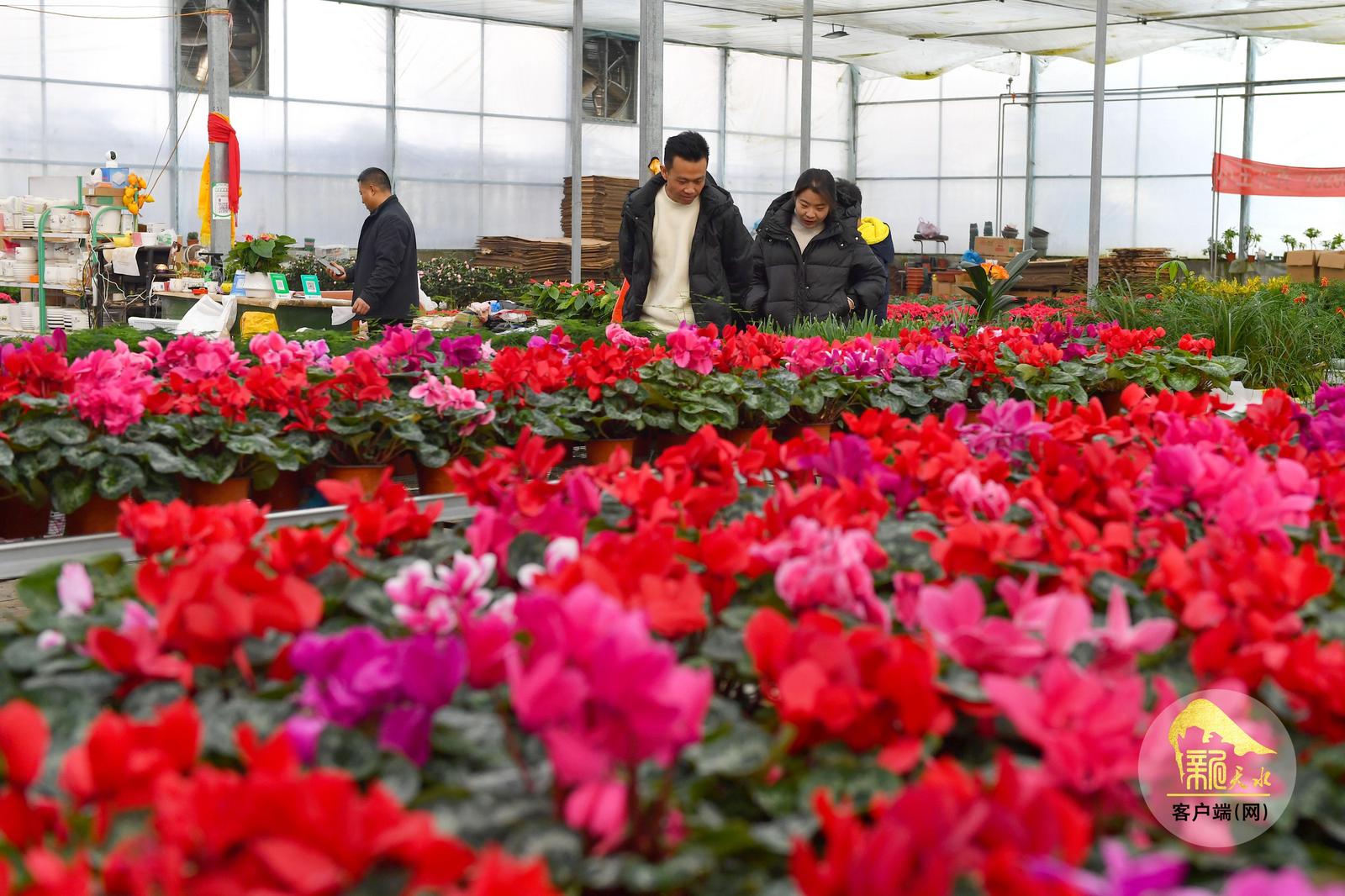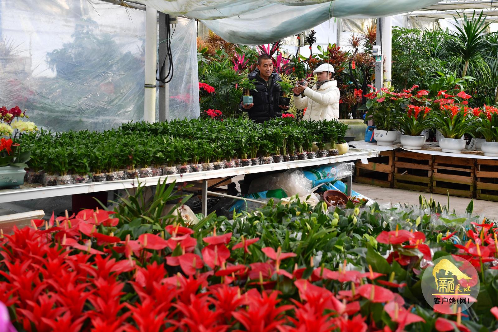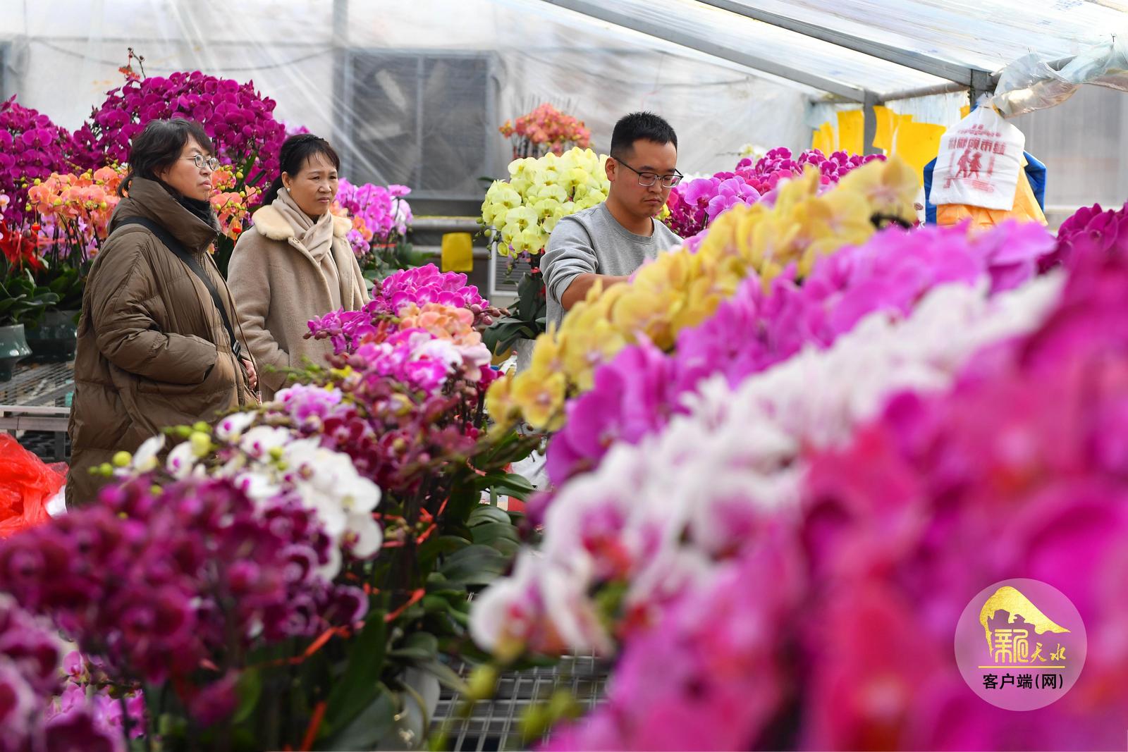 随着春节临近,天水市各大花卉市场年宵花陆续上市,进入销售旺季,吸引了众多市民前来赏花、购花,为即将到来的新春佳节增添喜庆气氛。(天水融媒记者 周文涛 摄)