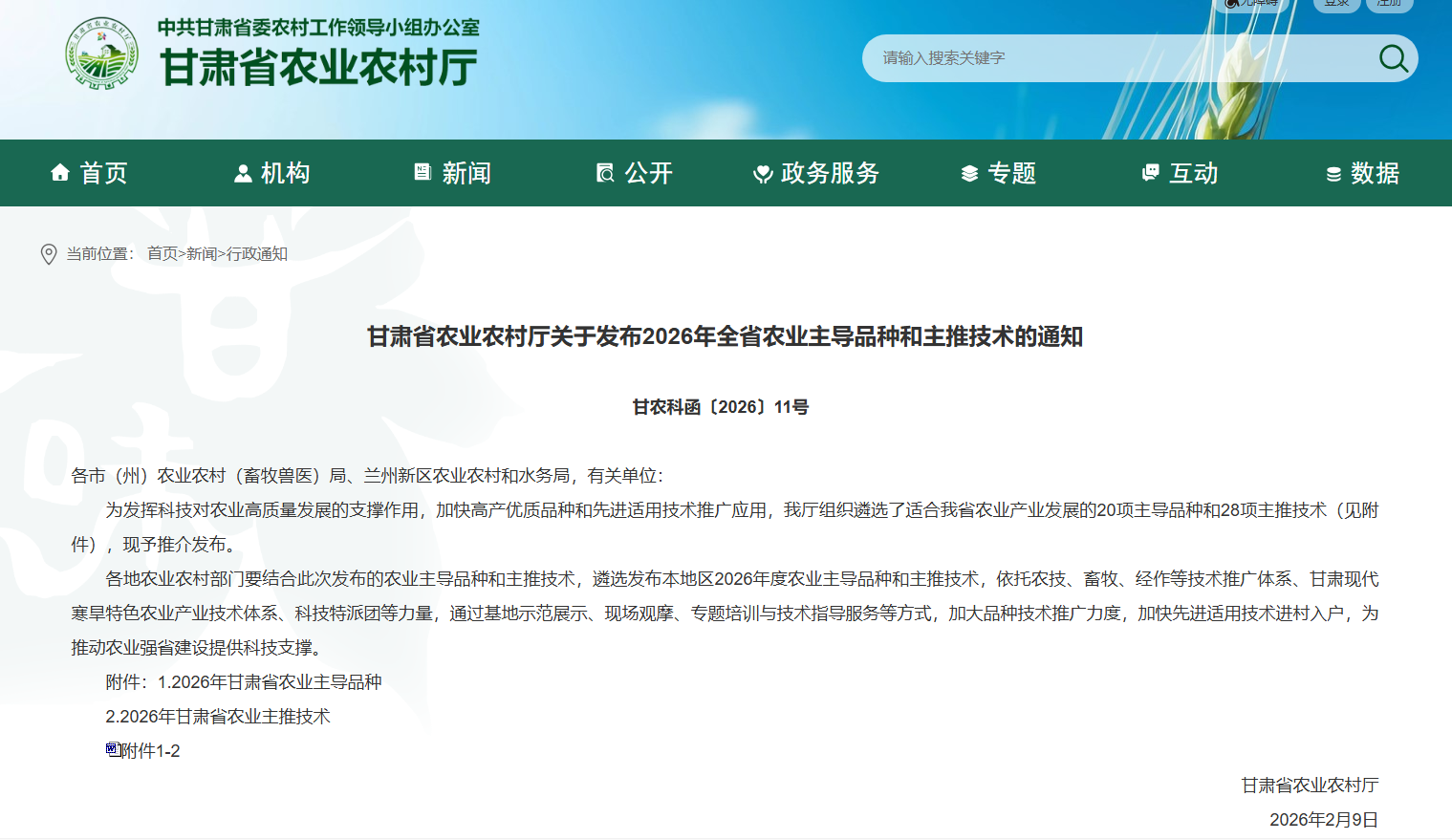 甘肃省农业农村厅关于发布2026年全省农业主导品种和主推技术的通知