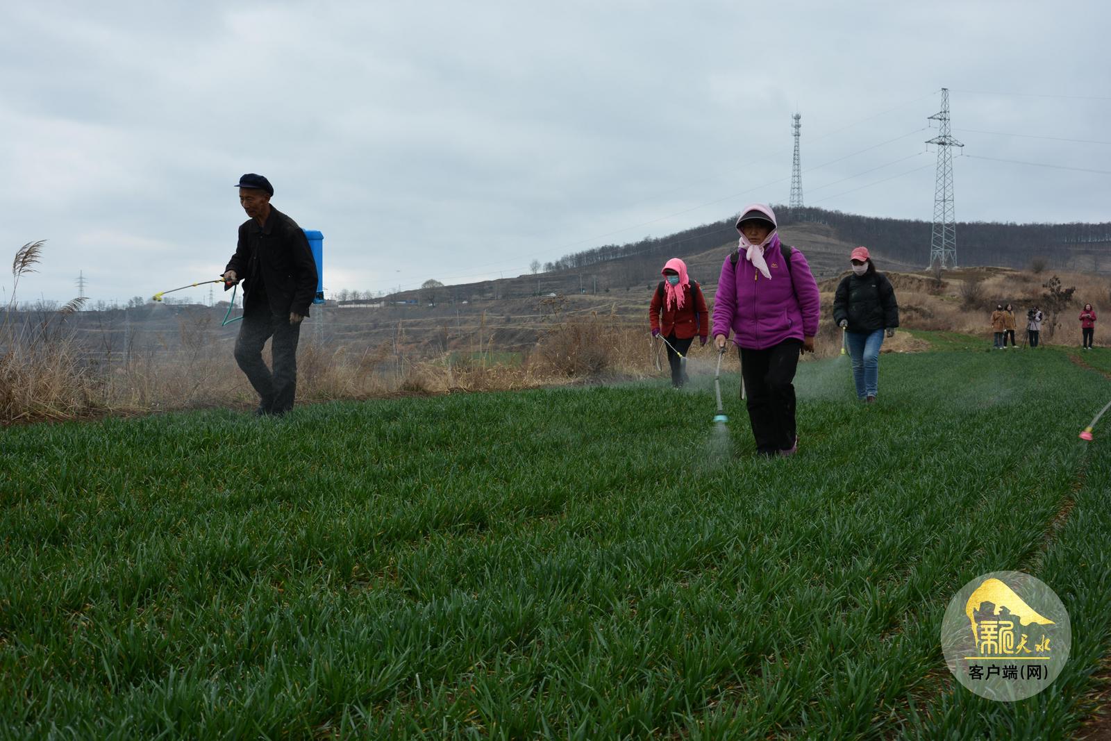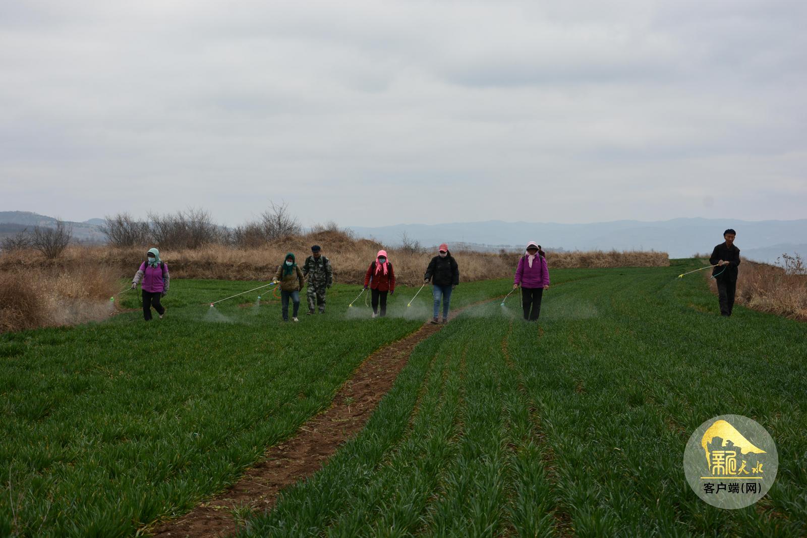 3月11日,连珠村麦田呈现一片繁忙景象。天水德合丰农业综合开发有限责任公司的工人三人一组,背负喷雾器穿梭田间,将细密雾滴均匀喷洒在麦苗上,为小麦喷施磷酸二氢钾、芸苔素内脂等叶面肥。“最近的春雨恰到好处,对小麦返青特别有利,必须抓紧时间施肥除草,为后续生长打好基础。”清水县农业技术推广站推广研究员纪粉霞一边查看麦苗长势,一边向公司负责人黄鹏飞细致讲解肥水配比技巧和小麦返青田管核心要点。