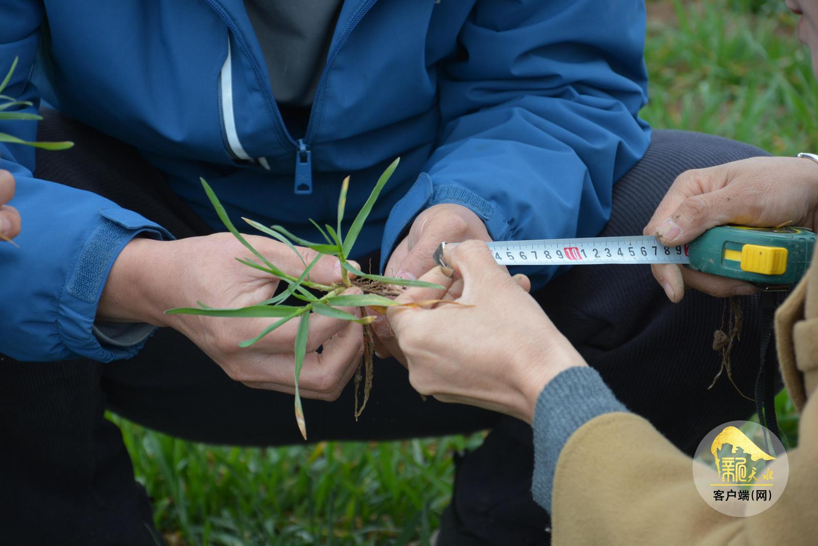 在连珠村的小麦单产提升基地,纪粉霞和技术人员们正分工开展苗情调查。有人用卷尺测量麦苗株高,有人仔细数着分蘖数量,有人在笔记本上详细记录数据。“分蘖有三到五叶,这属于一类苗。”纪粉霞一边讲解,一边指导团队规范开展调查。该基地设置了相同面积的试验田,重点开展小麦不同密度、不同品种、宽窄覆云播不同行距配比,以及两孔防锈等试验,通过科学对比筛选出适合西部半干旱山区的种植模式,为大田生产提供可靠依据。