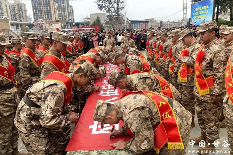 随后,全体新兵整齐列队、昂首挺胸,高举右拳庄严宣誓,铿锵有力的誓言响彻会场、久久回荡,既展现了新时代甘谷青年矢志军营、献身国防的坚定决心,也彰显了他们勇担时代使命、不负青春韶华的责任与担当。宣誓完毕后,新兵们怀着无比郑重的心情,在入伍承诺书上一笔一画地签下自己的名字,以笔墨为誓、以初心为诺,许下忠诚履职、不负韶华、守卫家国的铮铮诺言。