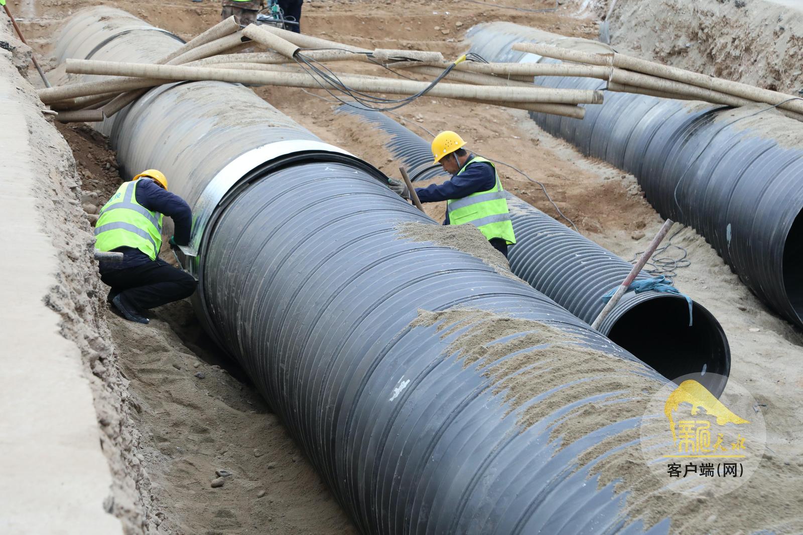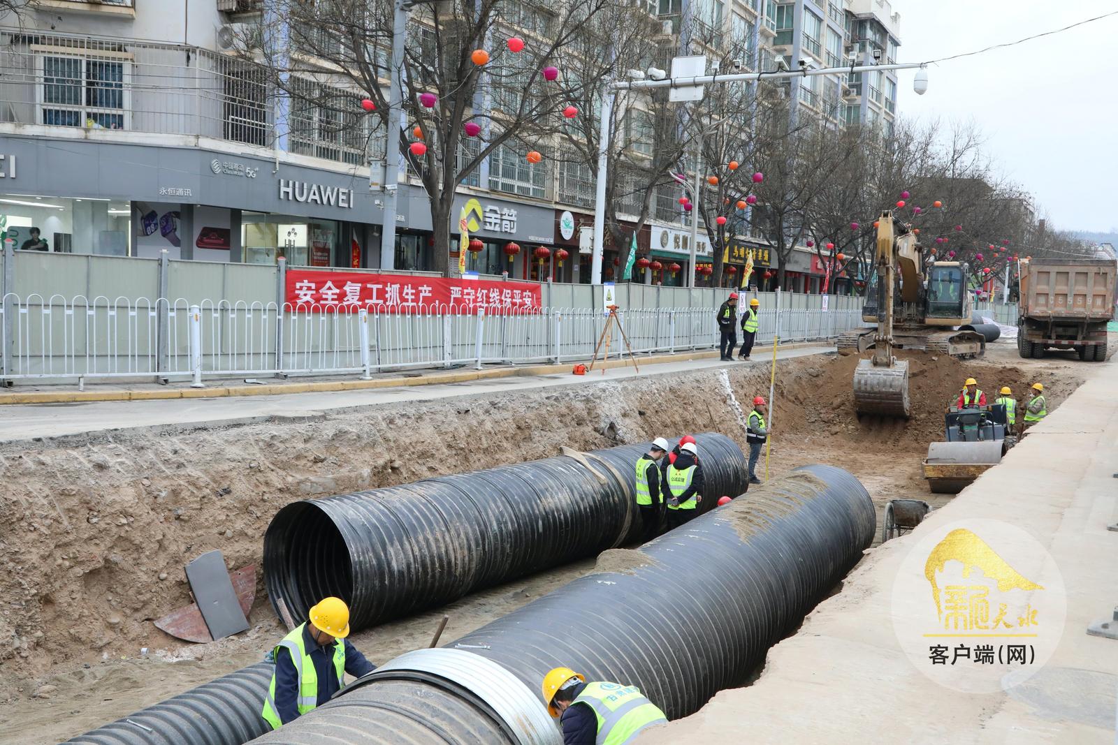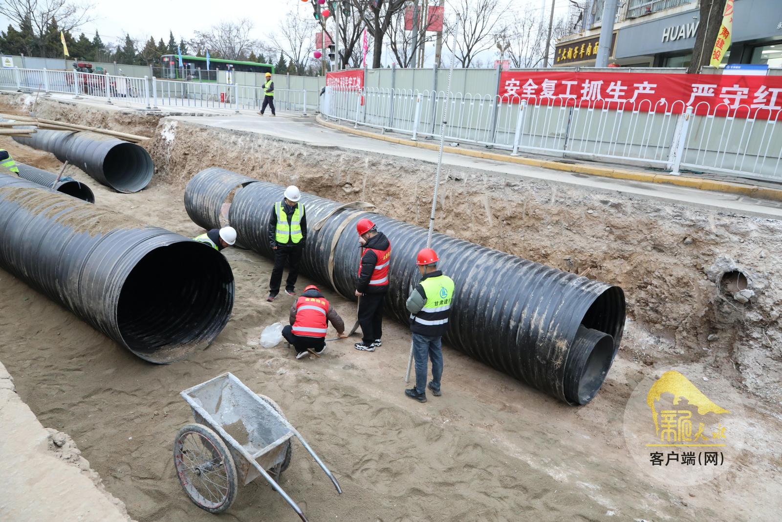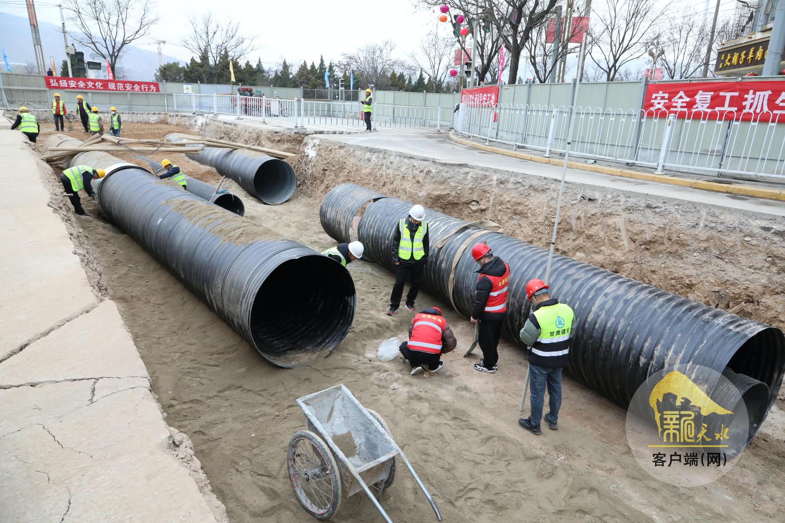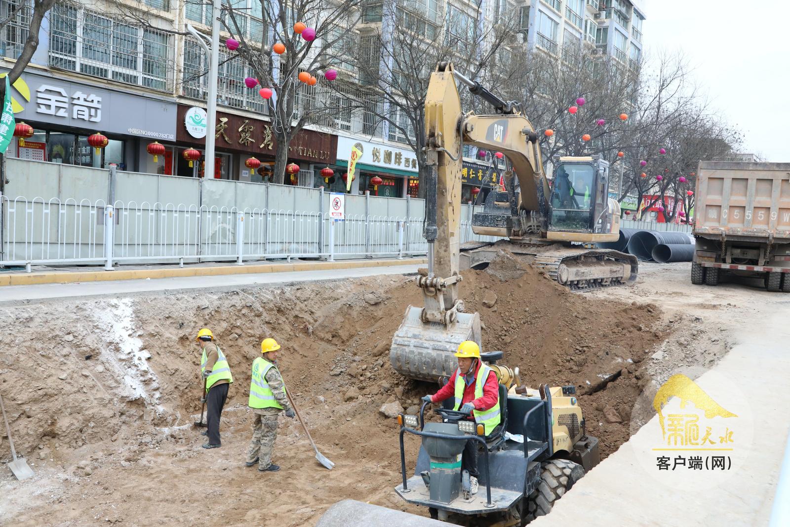 近日,在秦安县城区供排水管网提升改造工程建设现场,工人们正在加速施工。该项目是秦安县完善基础设施、提升城市承载力的重点民生工程,建成后将显著提升城市排水系统效率,有效缓解城市内涝问题,进一步改善居民生活环境,提升群众幸福指数。(天水融媒记者 马放 摄)