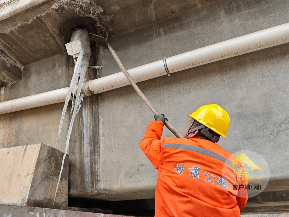 靶向治理,斩断高空“暗器”。桥梁高处,融化的雪水在夜间凝结成冰,悬挂的冰凌如同一柄柄“暗器”,随时可能坠落伤人伤车。隐患就是命令。张家川公路段坚持预防为先、靶向治理。桥梁周边的醒目位置,一块块安全警示牌被规范摆放,提醒过往车辆与行人注意避让、减速慢行。而另一边,桥梁专业技术员正手持专业工具,奔赴一个个隐患点位。他们仰头、举杆、敲击,将高空悬挂的冰块、冰凌逐一精细清除。一次次挥杆,斩断的是安全隐患,守护的是桥下群众的安全。