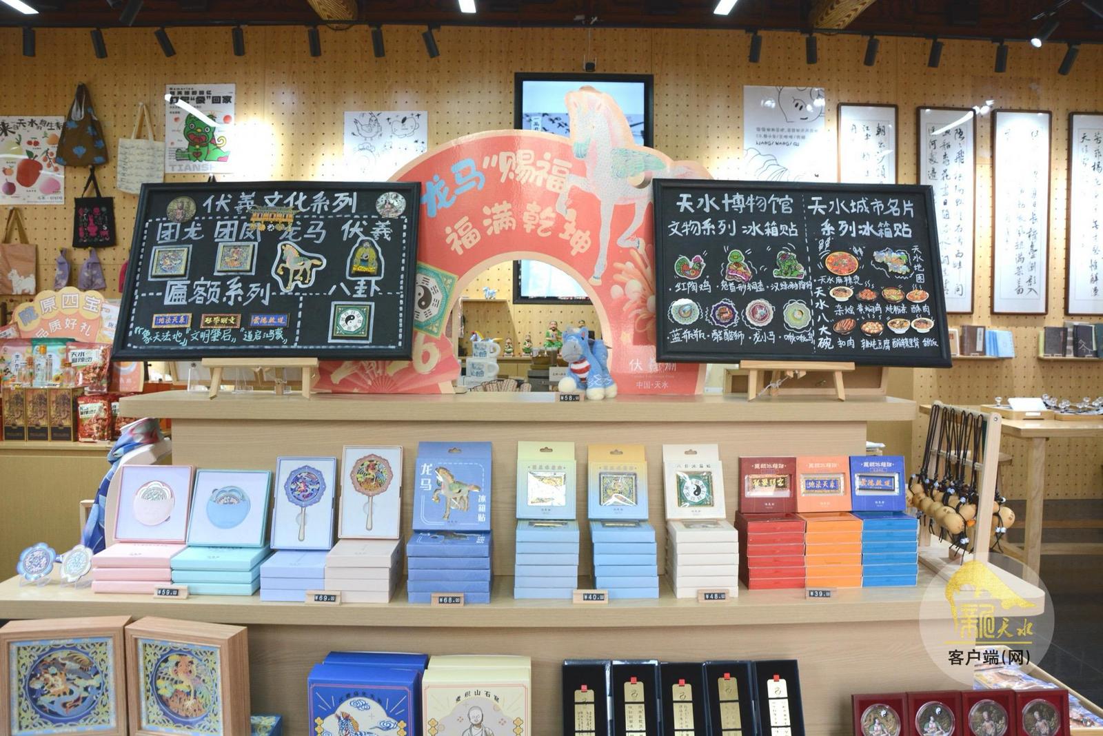 精致的伏羲庙冰箱贴、憨态可掬的“大地湾娃娃”、以花牛苹果为原型制作的毛绒玩具、惟妙惟肖的清水沙棘毛绒挂件……伏羲庙文创商店中独具天水特色的文创产品,吸引不少游客驻足挑选。天水市伏羲庙文创店工作人员郭钰延告诉记者,天水市博物馆深入挖掘伏羲文化内涵,自主设计研发了伏羲庙扇形钥匙扣、伏羲庙黑檀木书签、龙马玩偶、河洛卦牌、四神八卦纹铜镜等19款特色文创产品,这些精美的文创产品吸引众多游客把“天水”带回家。