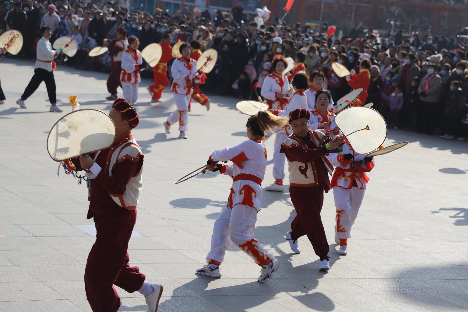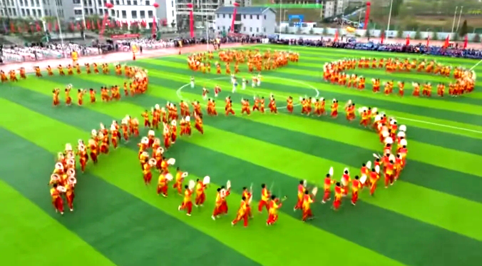 传统文化的活态传承。旋鼓套路“蛇龙摆尾”也叫“长蛇阵”,是伏羲文化图腾崇拜的体现,伏羲女娲人首蛇身,行“禹”步。蛇龙摆尾就是模仿蛇行,队形弯曲摆动行进,形如长蛇行走。“花开富贵”套路,形如牡丹花开,层层绽放,寓意美好吉祥,幸福绵长。花开富贵的意象在传统民俗文化中广泛体现,是中国传统吉祥图案,以繁花盛开象征富贵昌盛的生活愿景,图案以牡丹为主体,常与竹报平安组合,寓意富贵降临。元代牡丹纹饰出现在瓷器上,明清时形成珐琅彩、粉彩等多种工艺载体。武山非遗刺绣、橄榄核雕、夜光杯雕、木雕、砖雕等工艺品常以牡丹为主体元素,通过缠枝纹、花鸟组合等形式传递富贵吉祥的祝福。此外,还有“富贵不断头”“五凤朝天飞”等。