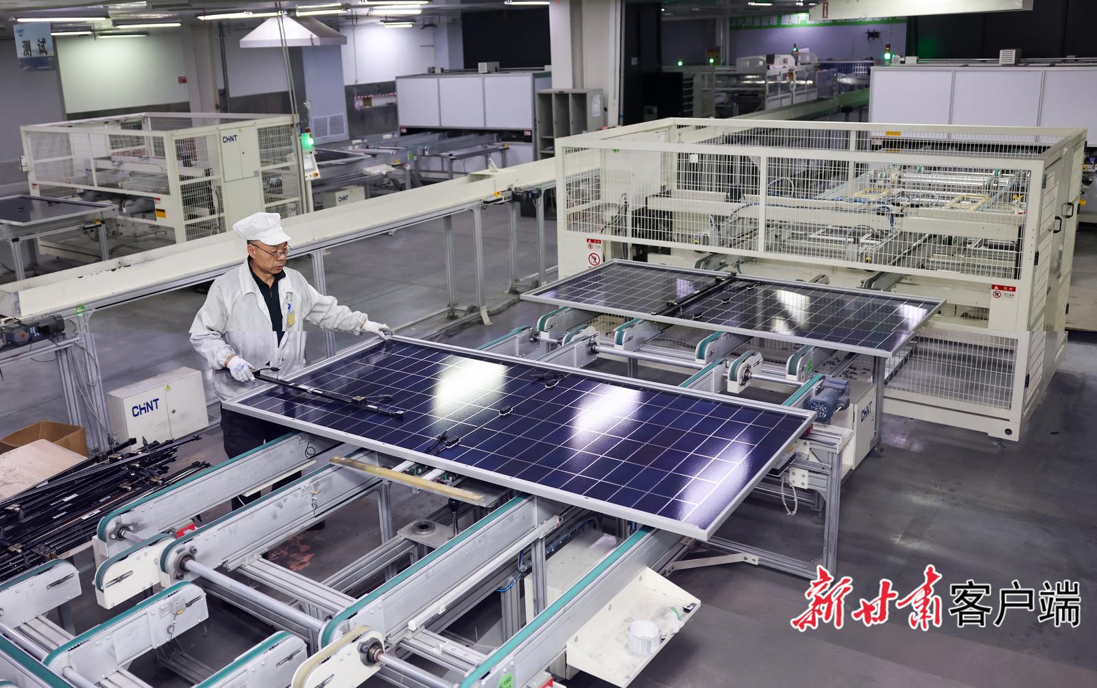 正泰光伏装备智能制造产业基地光伏组件生产线上,工作人员正在安装光伏板组件。新甘肃·甘肃日报记者 冯乐凯
