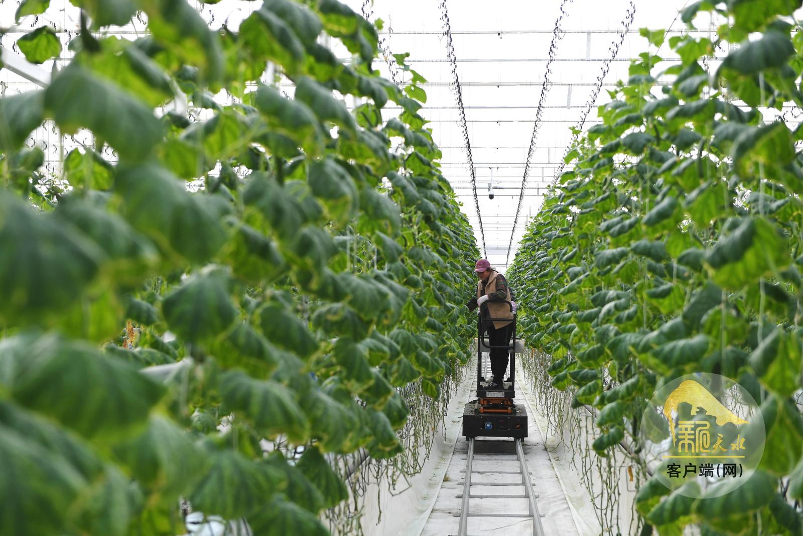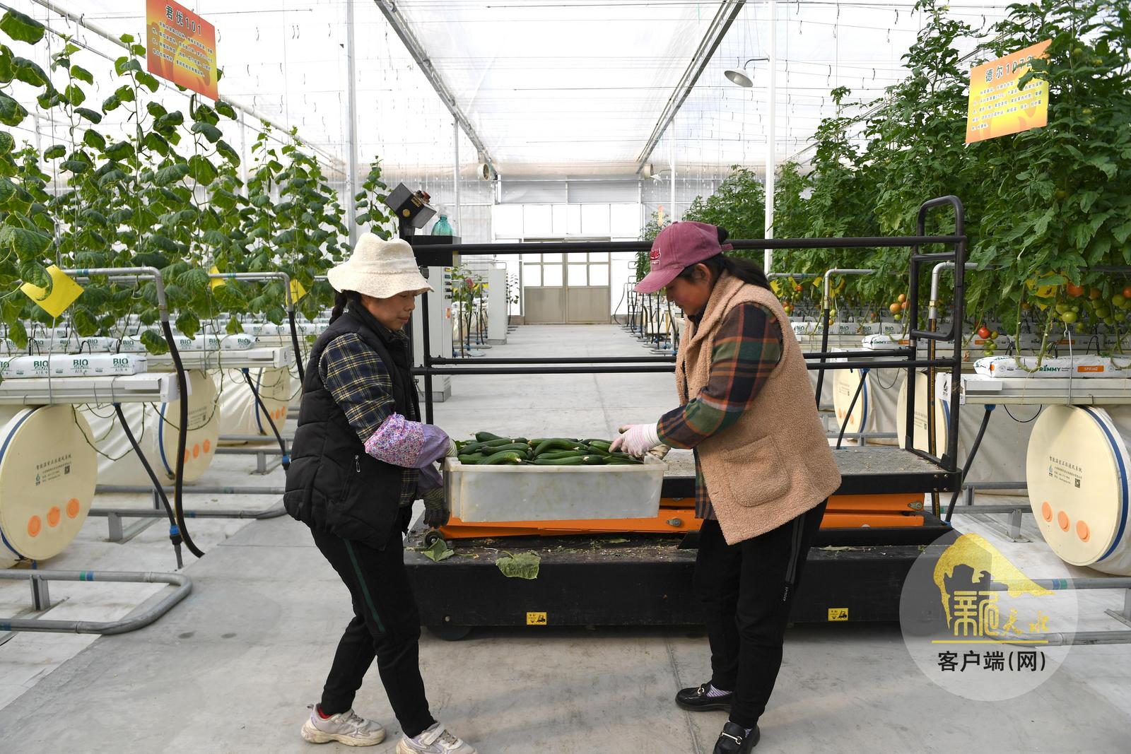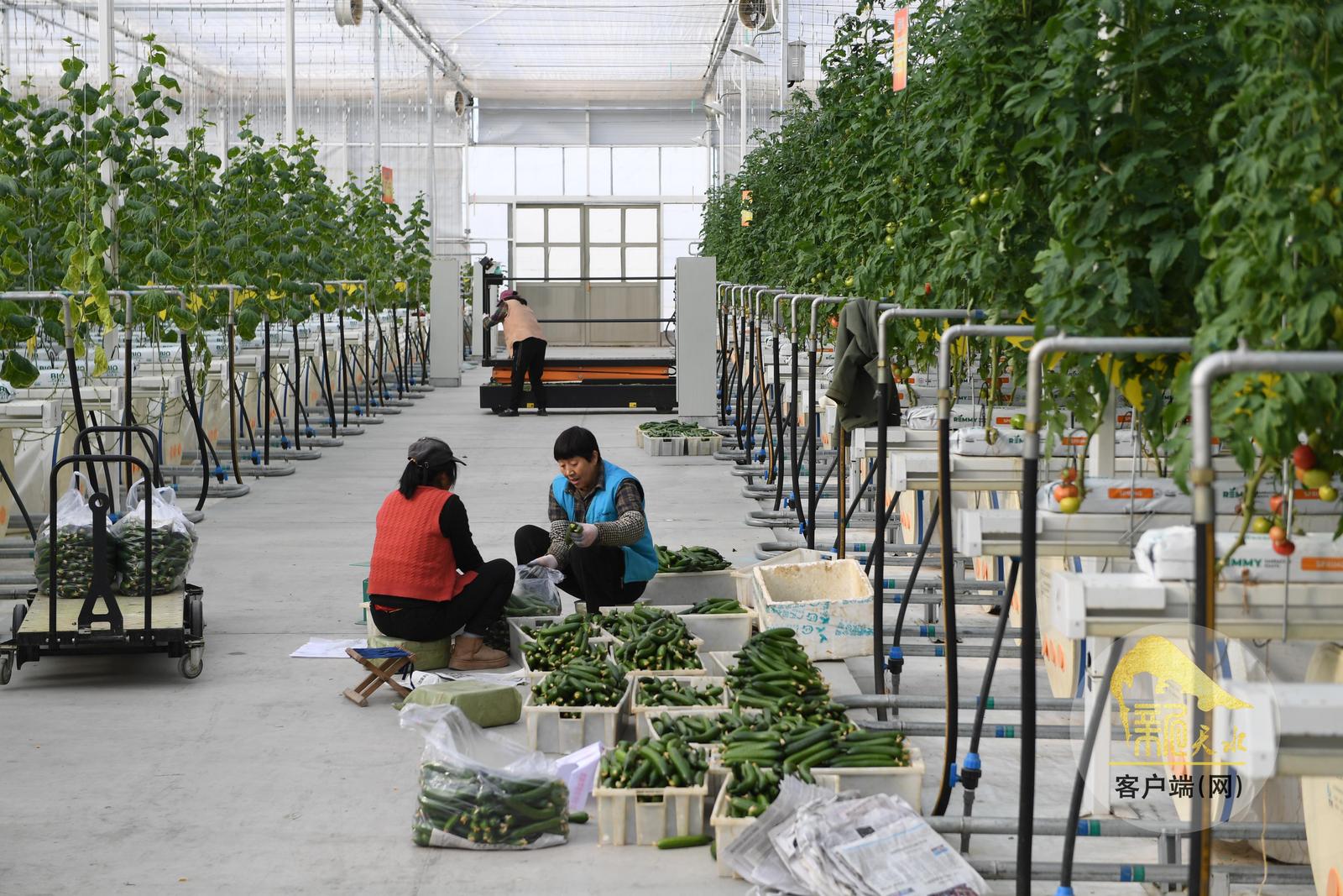 3月27日,在武山县现代农业产业园的标准化智能玻璃温室,工人正在采收新品种黄瓜。