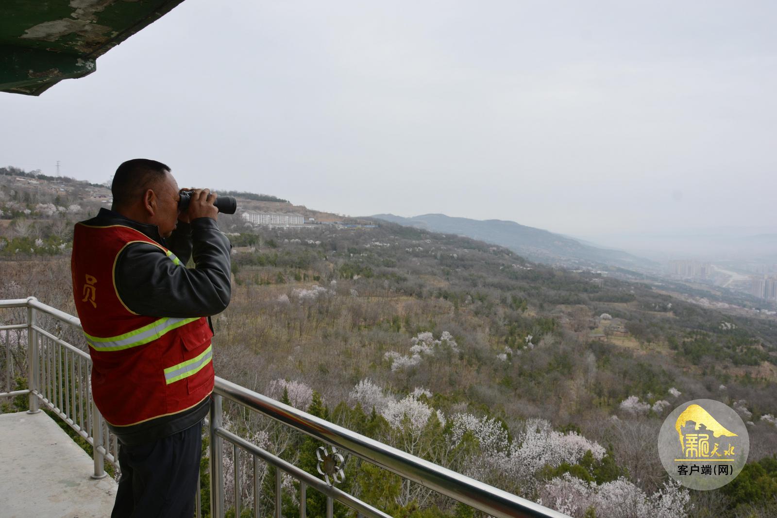 站在秦州区红旗山皇城堡瞭望塔,整座城区的山林风貌尽收眼底,这里是守护秦州城区南北两山的“前沿哨所”。护林员孟世存日复一日坚守于此,24小时不间断值守成为他的工作常态。“在这里值守一刻也不敢松懈,拿着望远镜反复查看周边山林情况,就怕有火情隐患。”