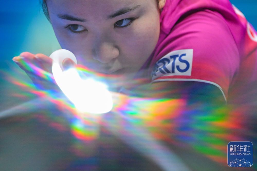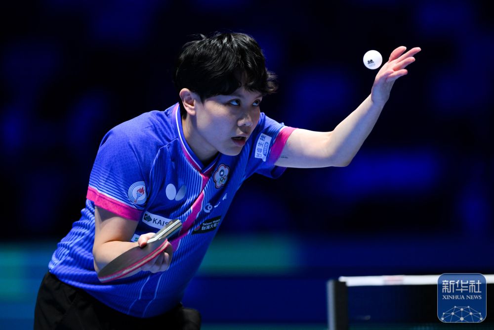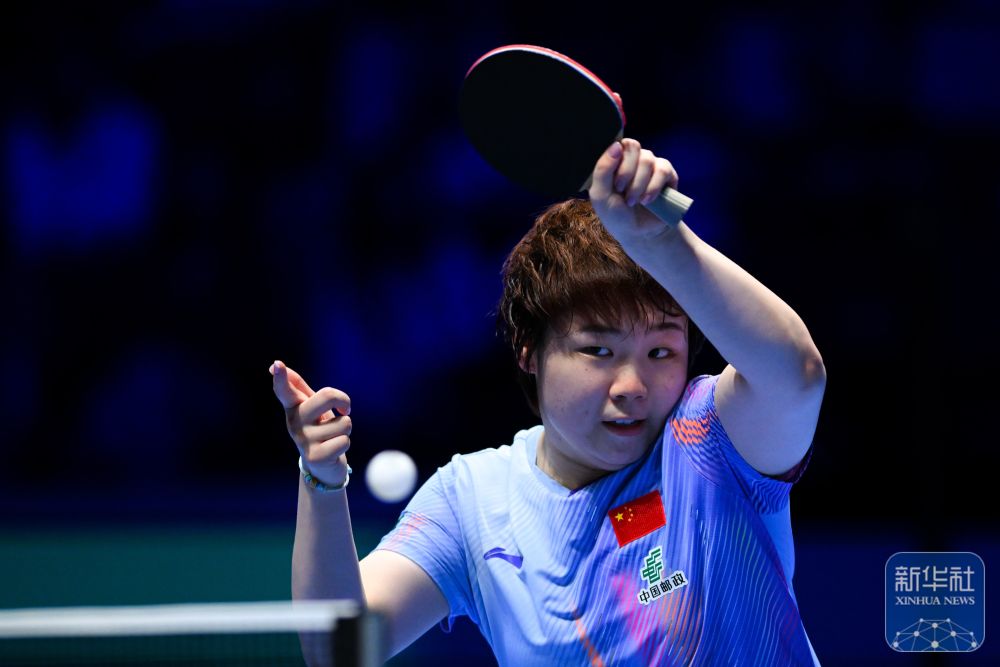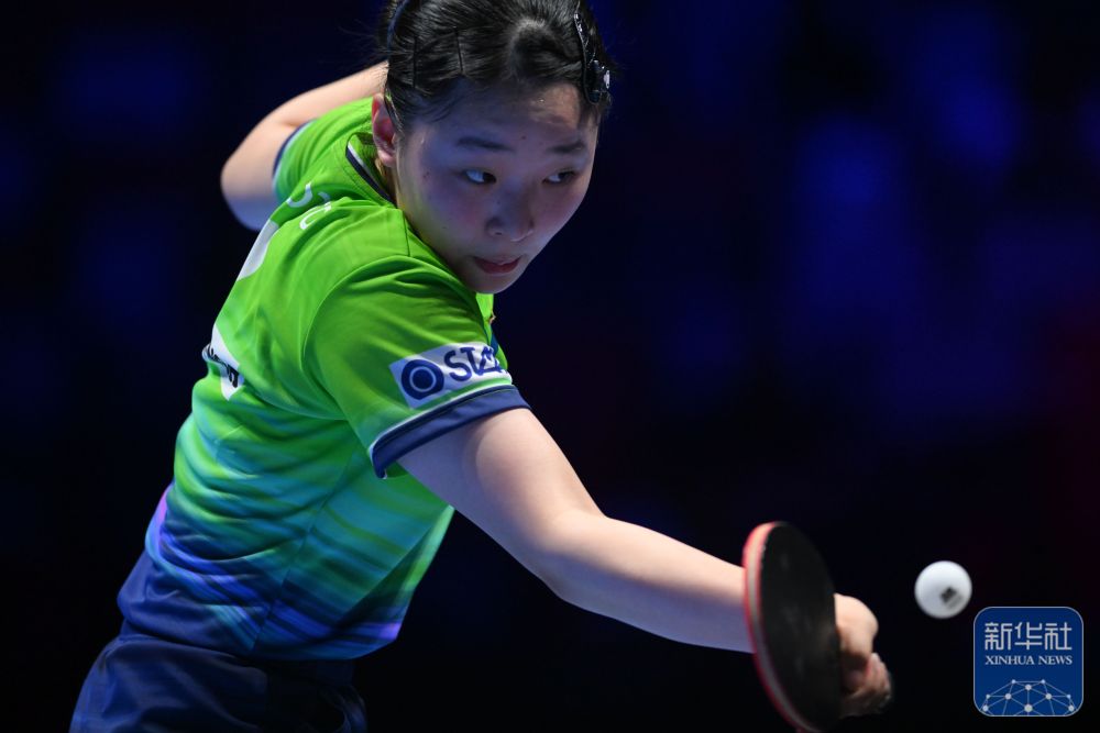 ↑中国选手蒯曼在女子单打小组赛中回球。最终,她3比2战胜法国选手夏洛特·卢茨。