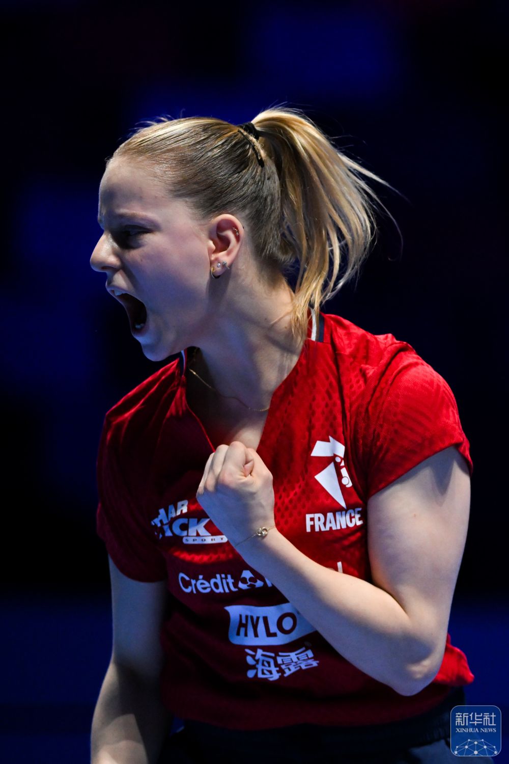 ↑法国选手夏洛特·卢茨在女子单打小组赛中庆祝得分。最终,她2比3不敌中国选手蒯曼。