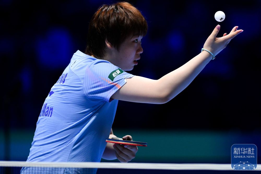 ↑中国选手蒯曼在女子单打小组赛中发球。最终,她3比2战胜法国选手夏洛特·卢茨。