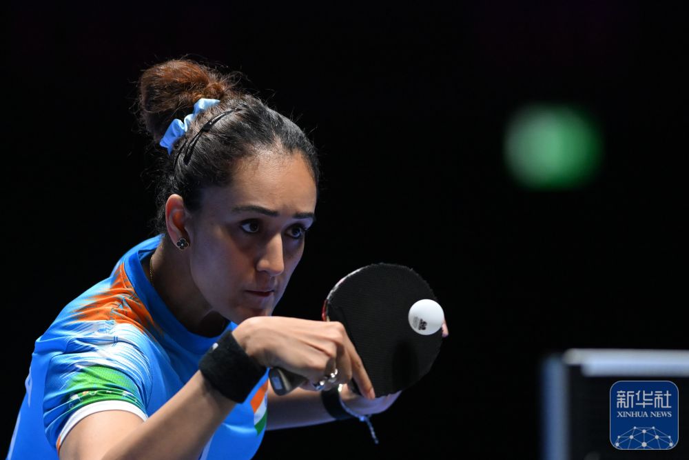↑印度选手马妮卡·巴特拉在女子单打小组赛中回球。最终,她0比3不敌日本选手张本美和。