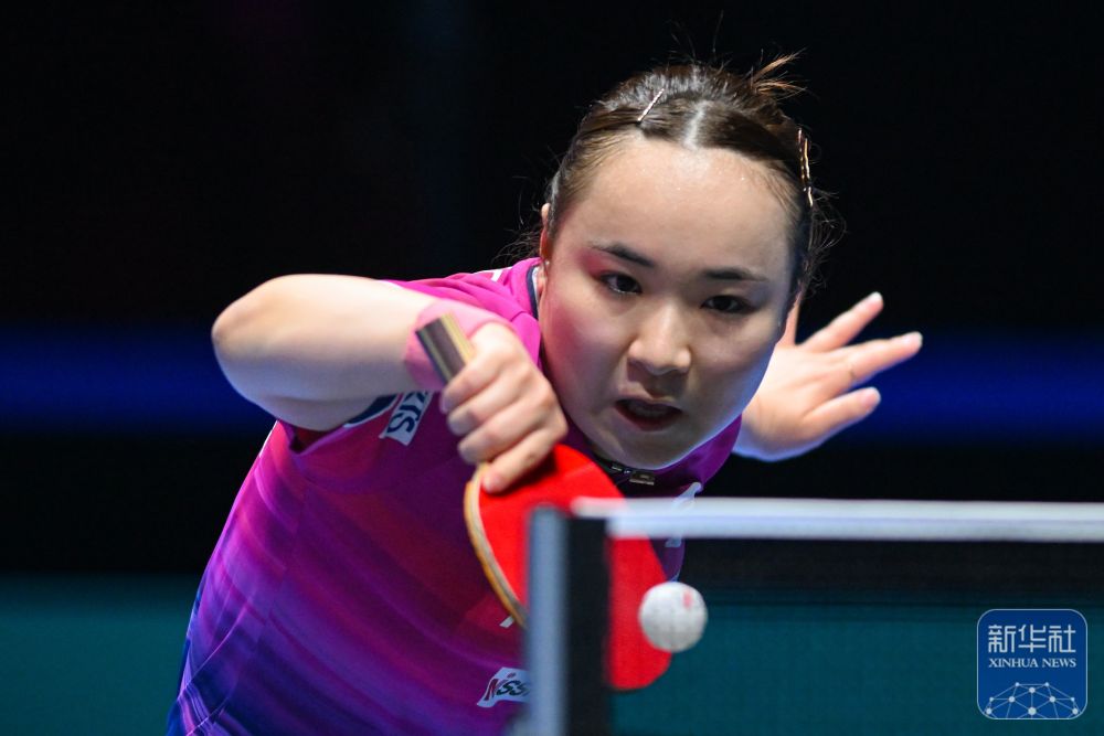 ↑日本选手张本美和在女子单打小组赛中回球。最终,她3比0战胜印度选手马妮卡·巴特拉。