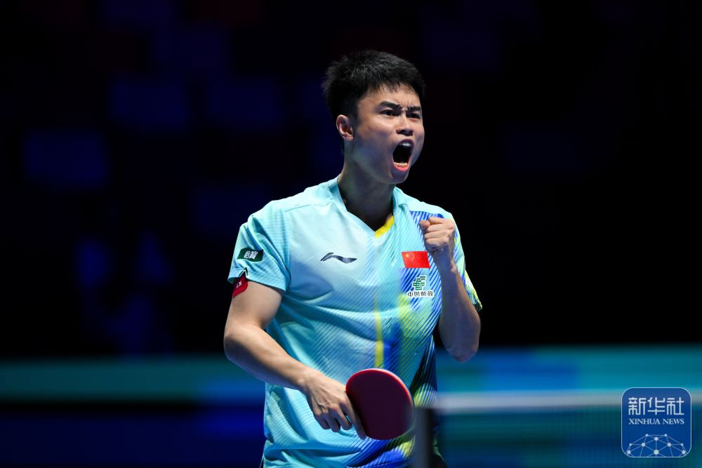 ↑中国选手周启豪在男子单打小组赛中庆祝得分。最终,他3比1战胜日本选手川上流星。