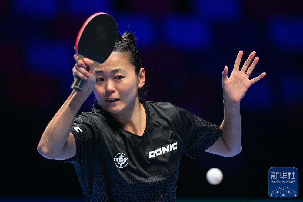 ↑加拿大选手张默在女子单打小组赛中回球。最终,她2比3不敌日本选手伊藤美诚。
