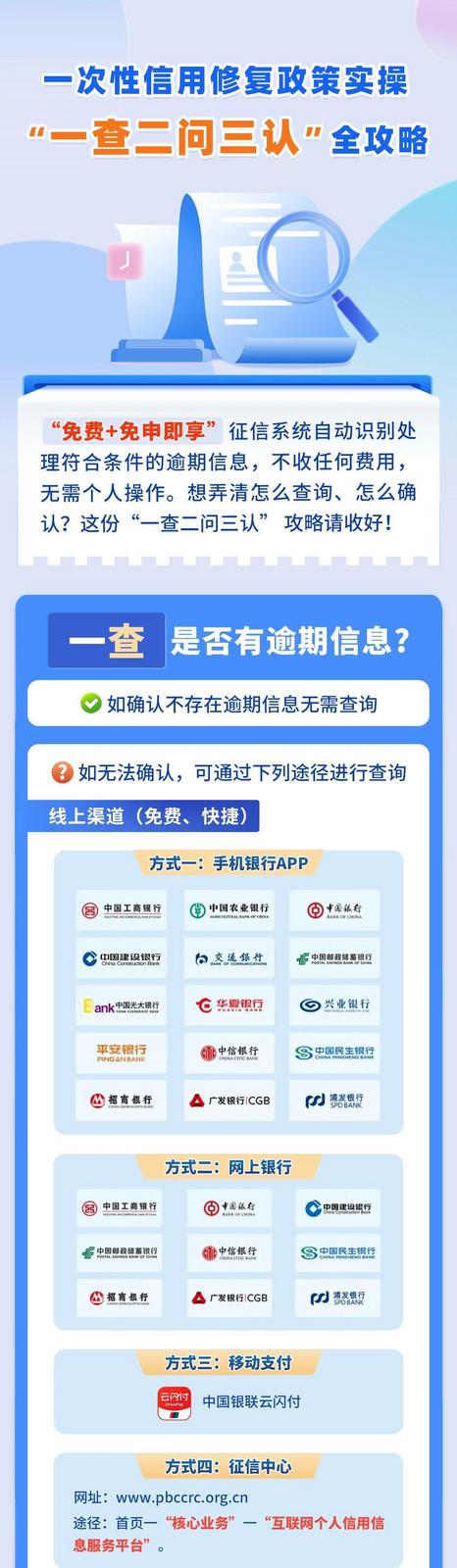 一次性信用修复实行免申即享,个人无需申请和操作,也无需提交证明材料,由中国人民银行征信系统对符合条件的逾期信息进行自动识别和统一处理。作为这项政策的配套福利,人民银行还增加了个人信用报告免费查询的机会,方便大家及时核对逾期记录,确认修复进度。
