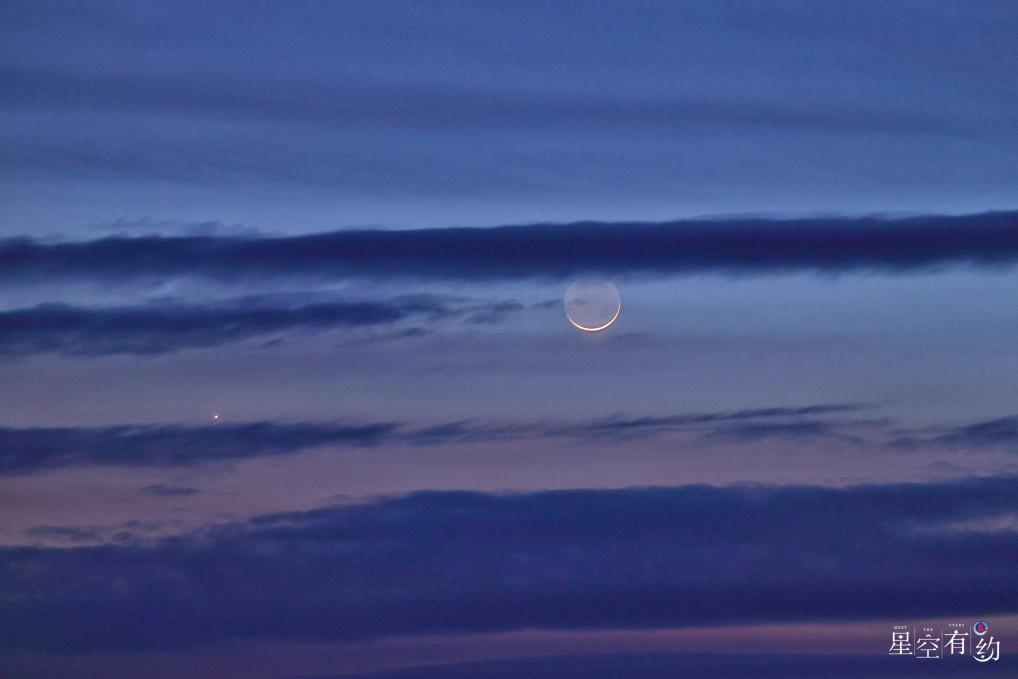 2025年4月1日,在黑龙江省富锦市拍摄的年度最大蛾眉月。(庚喜庆 摄)