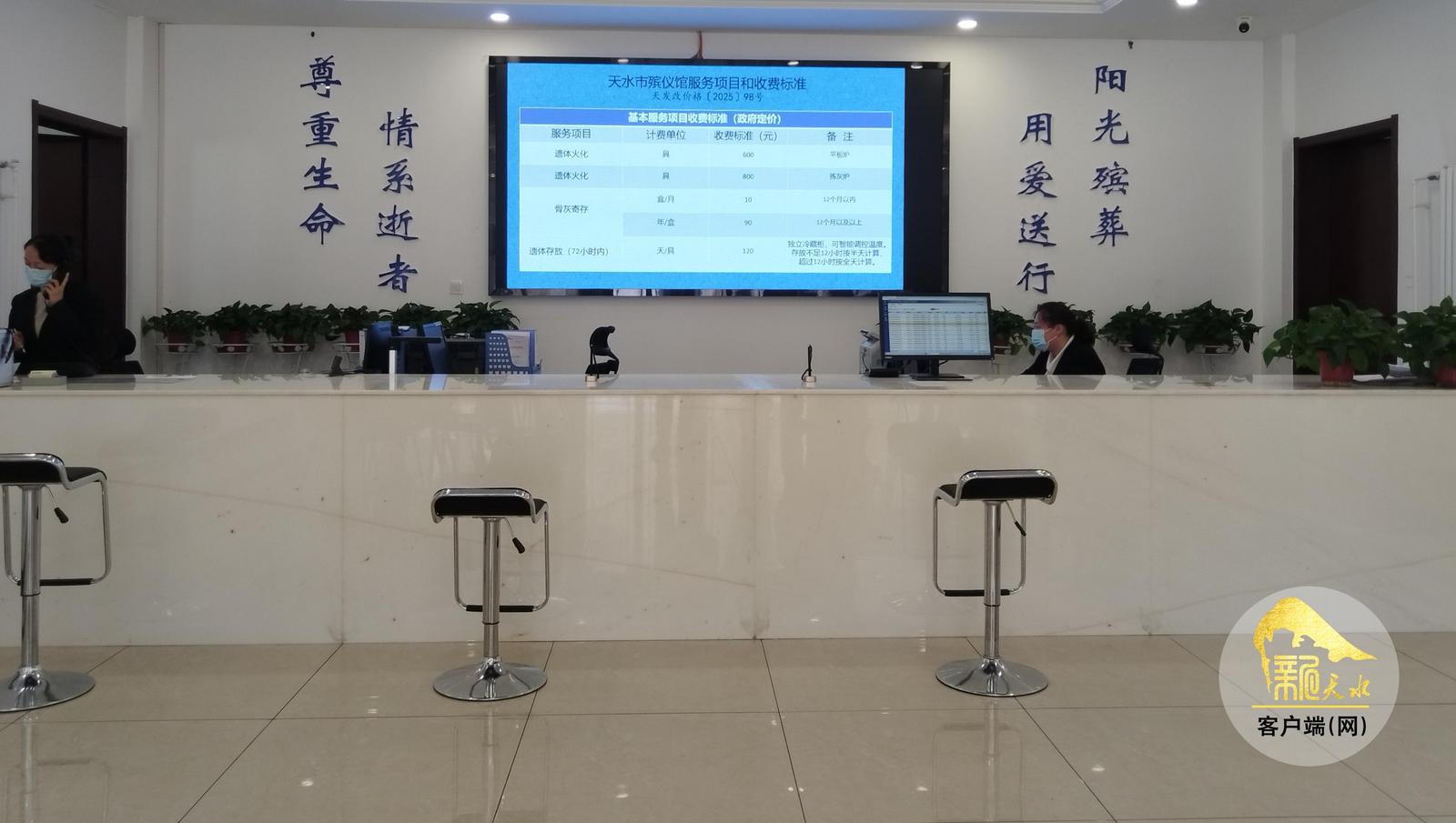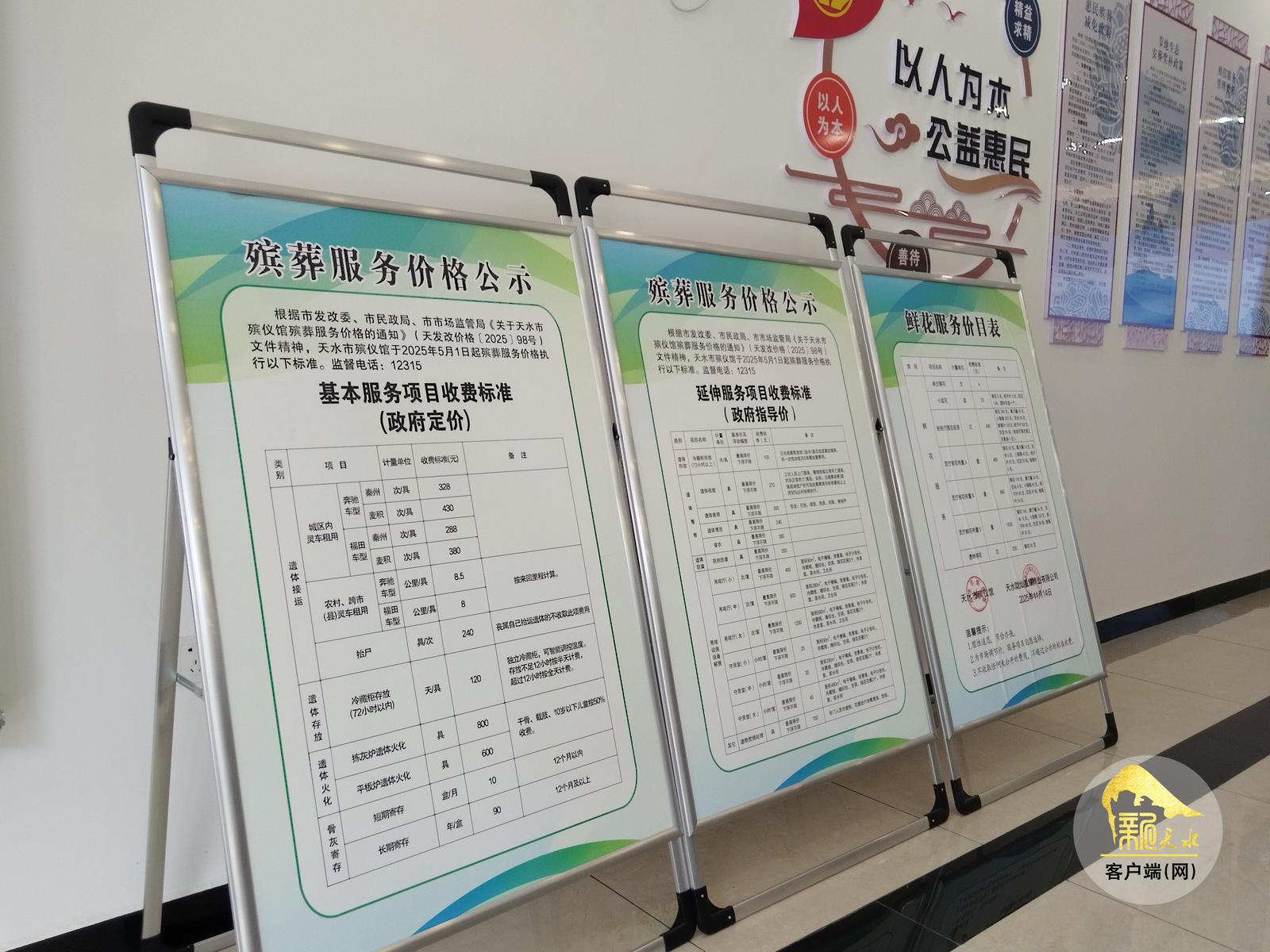 新馆园区环境静谧幽雅,风格简约而庄重。走进天水市殡仪馆综合服务厅,室内宽敞明亮,张贴在墙面上的“以人为本,公益惠民”八个字格外醒目,其旁边设置的殡葬服务价格公示牌以及大厅正中央的电子屏上,对基本服务项目、延伸服务项目等收费标准都有明确公示,一目了然。在天水市盘龙山公墓,记者同样看到了公墓管理中心在墓园出入口处设置了公示栏,将延伸服务收费价格等进行了公示。
