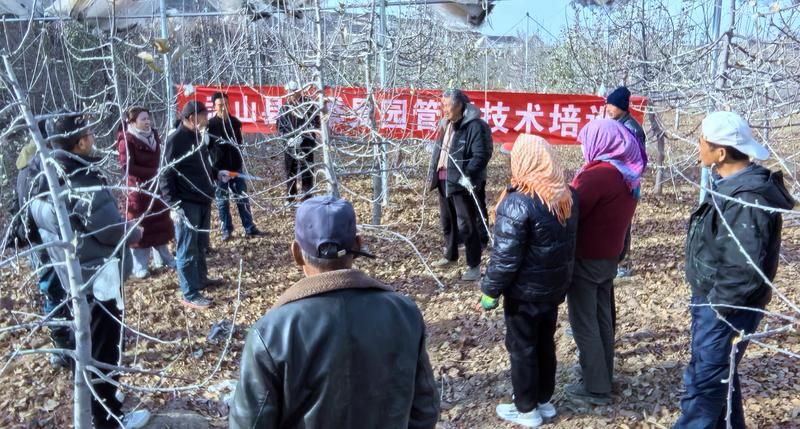 新天水讯 据武山县融媒体中心消息 日前,武山县果业发展中心在洛门镇关山村组织开展苹果树修剪管理技术现场培训,特邀退休高级农艺师焦六十二亲临果园授课,与果农共同探讨交流果树管护举措。
