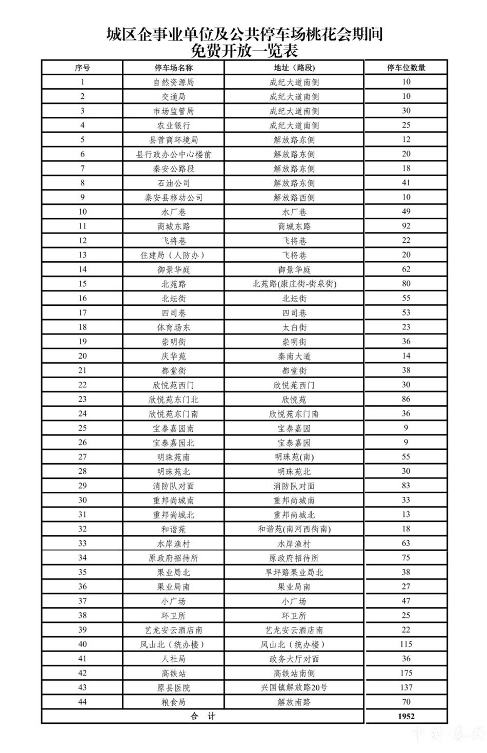 新天水讯 据秦安县融媒体中心消息 以花为媒,以诚待客。2026年甘肃秦安桃花会开幕在即,为切实做好桃花会期间服务保障工作,有效破解游客出行停车难题,秦安县提前谋划、精准施策,决定在桃花会期间免费开放44处停车场,提供1952个停车位,并同步在城区解放路非机动车道增设临时停车泊位,以实实在在的服务迎接八方来客,让游客在畅游桃乡美景的同时,感受城市的温度与诚意。