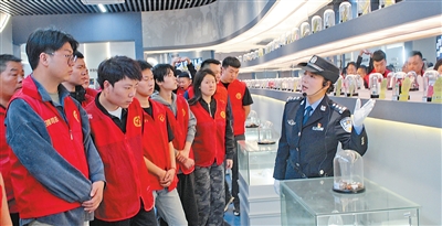 王妙丽(右一)在河南省第二强制隔离戒毒所禁毒教育基地为前来参观的学生作禁毒宣讲。 资料图片 □人民日报记者 方敏 |