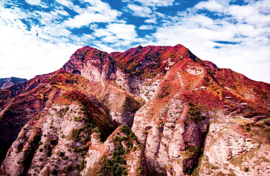 灯笼峰在堡子沟南侧的悬崖之上,因形似灯笼而得名。沟内有一石洞,洞内山泉叮咚,清冽悦耳,往洞内前行百余步,可见终年不化的坚冰,既是天然消暑胜地,又可解游人烦渴,宛如一座天然冰库。从灯笼缝西行数百米,便至大士庵,这是一处天然石窟,高数十丈,占地百余平方米,庵前树木森森、修竹芊芊,如一道绿帘遮掩庵门,意境清幽。庵内有数十张黄、黑、红、白各色石凳,皆被岁月磨得光滑细腻,四壁裂缝间是飞禽的乐园,燕子、百灵、麻雀成群地绕庵啼鸣,与游人相映成趣,生机盎然。
