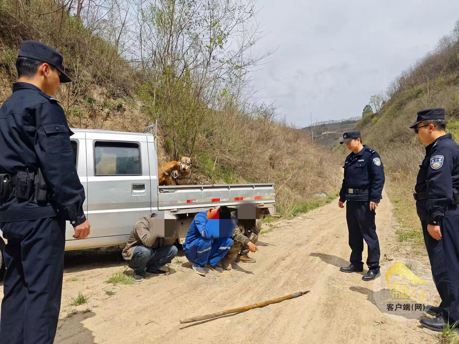 获悉线索后,派出所高度重视,立即抽调精干警力组建专案组。经过多日昼夜蹲守和全面走访排查,专案组精准锁定犯罪嫌疑人师某、韩某、付某的活动轨迹,并果断出击将其抓获,现场查获管制刀具三把、猎犬六只及轻型卡车一辆。