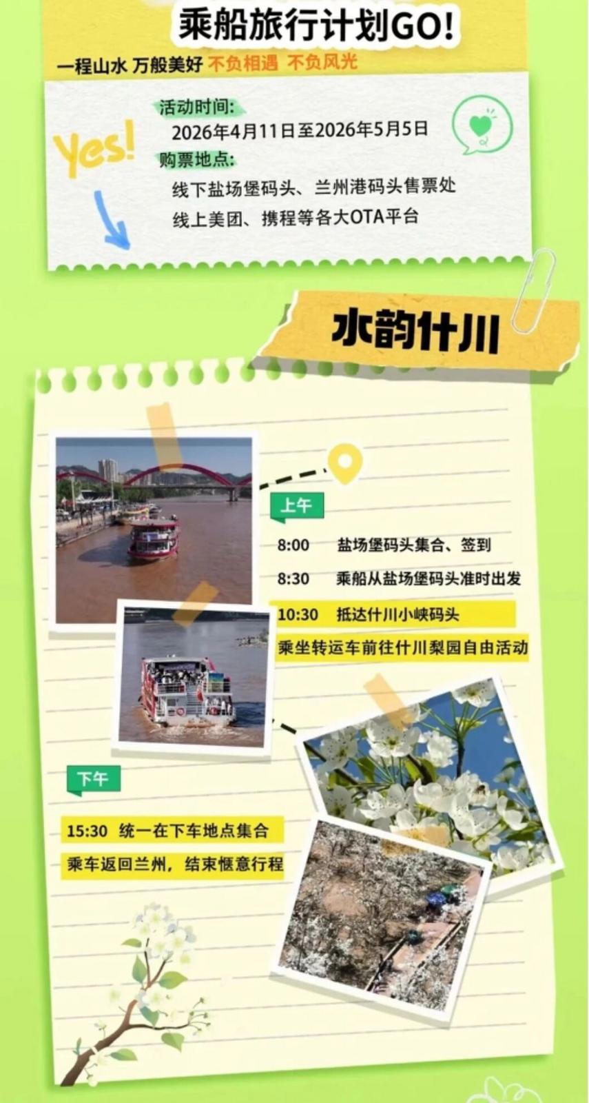 换一种方式赴梨乡——乘船而行,看黄河碧波荡漾,赏两岸梨花如雪,浪漫与诗意恰到好处。“水韵什川”“兰州黄河大峡谷”双航线任意选择!