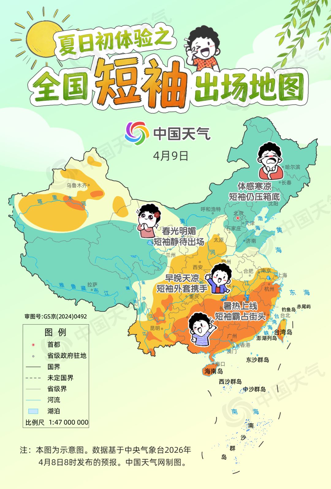 其中9日,华南大部暑热持续,海南等地还会有高温出没,短袖稳稳霸占街头;江南部分地区暖热升级,湖南、江西、浙江等地最高气温将冲上30℃,杭州、南昌等城市将现今年首个30℃+,短袖也可以出场了。四川盆地、湖北、陕西中南部、山西南部、河南西部、安徽南部、江苏南部白天暖意融融,但早晚仍然天凉,可采用洋葱式穿衣法,短袖外套携手。东北、华北北部、青藏高原等地体感寒凉,需厚外套护体,短袖仍压箱底。