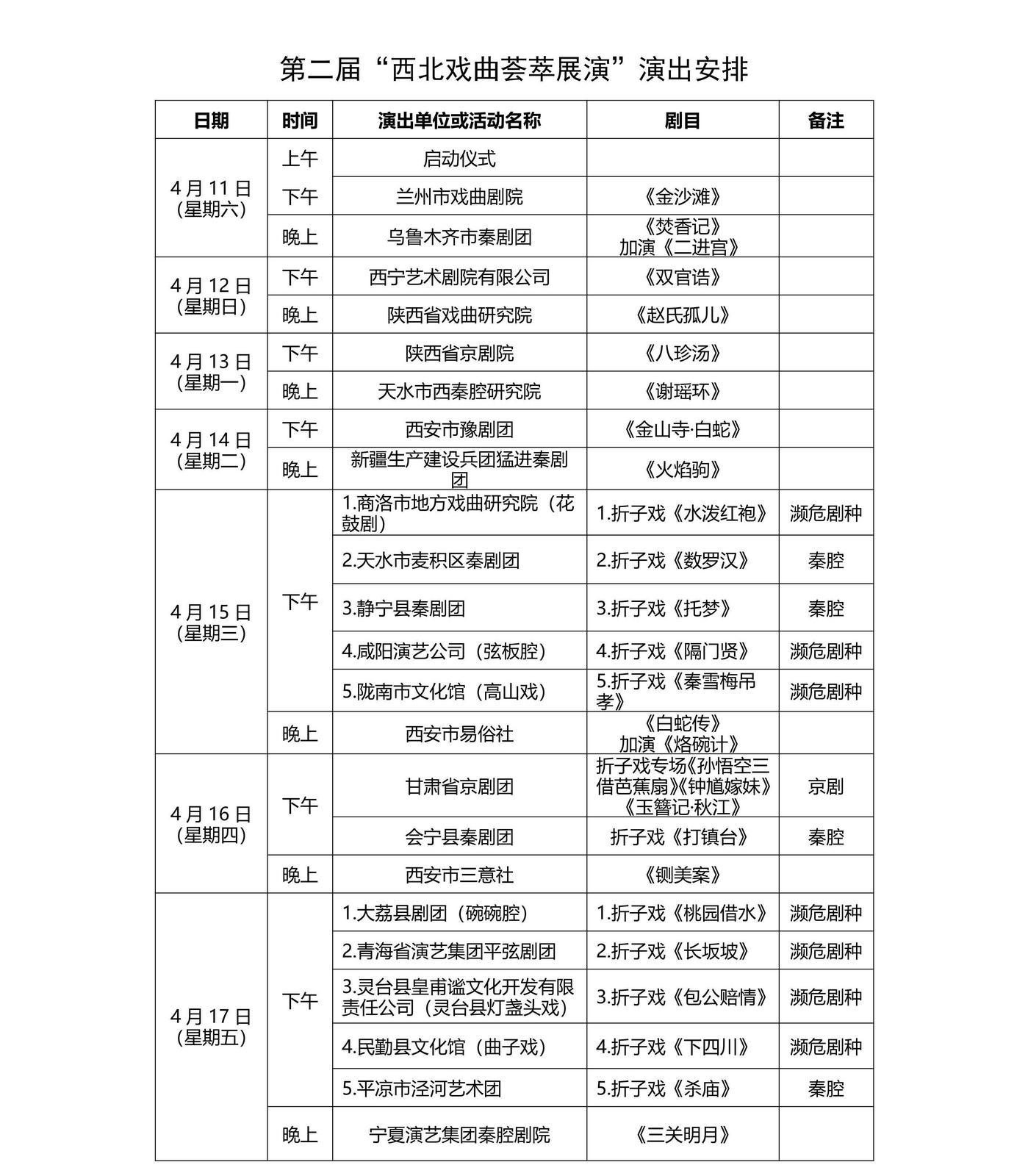 多剧种同台争艳、经典与濒危并举是本次展演的最大亮点。4月11日,兰州戏曲剧院将携秦腔传统剧目《金沙滩》拉开展演序幕,陕西省戏曲研究院、宁夏演艺集团秦腔剧院等单位将相继献上《赵氏孤儿》《三关明月》等秦腔名剧。此外,陇剧《大河东流》、京剧《八珍汤》、豫剧《金山寺·白蛇》等经典剧目轮番上演,商洛花鼓剧、汉调桄桄等濒危剧种也将登台亮相,让观众领略小众剧种的独特韵味。