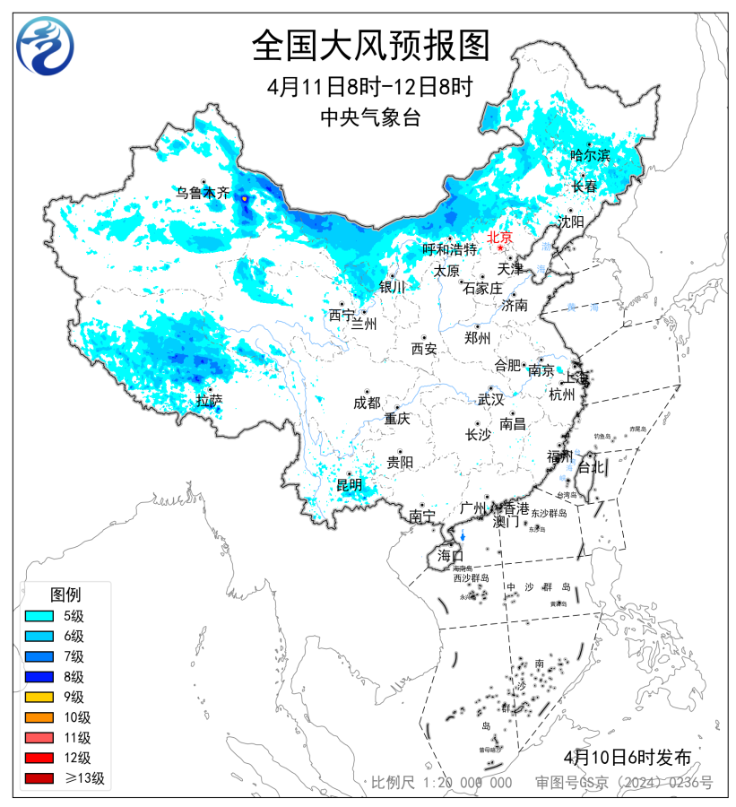 预计,4月11日08时至12日08时,新疆东部和北部、内蒙古大部、黑龙江南部、吉林大部、辽宁西部、河北北部、甘肃西部和北部、青海北部、西藏中西部、云南中东部等地部分地区有5~7级风,阵风8~9级,新疆北疆东部局地阵风10级以上。