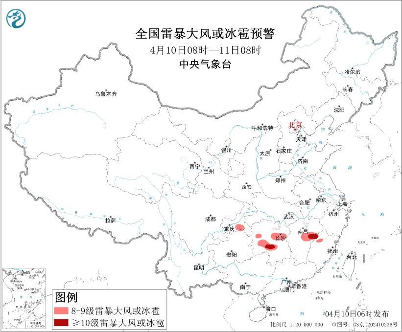 中央气象台继续发布强对流天气蓝色预警:预计4月10日8时至11日8时,江南中部等地的部分地区将有8级以上雷暴大风或冰雹天气,其中,湖南中南部、江西中东部、福建西北部等地的部分地区将有10级以上雷暴大风,最大风力可达11级以上;江南中部、西南地区东北部等地的部分地区将有小时雨量大于20毫米的短时强降水天气,其中,湖南中部的部分地区小时雨量大于50毫米。