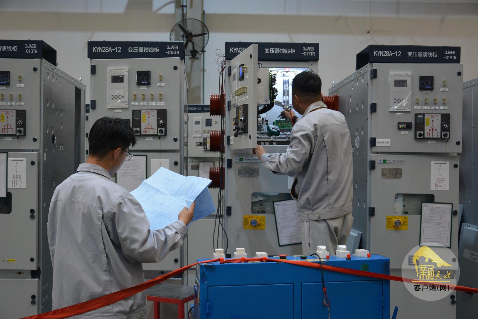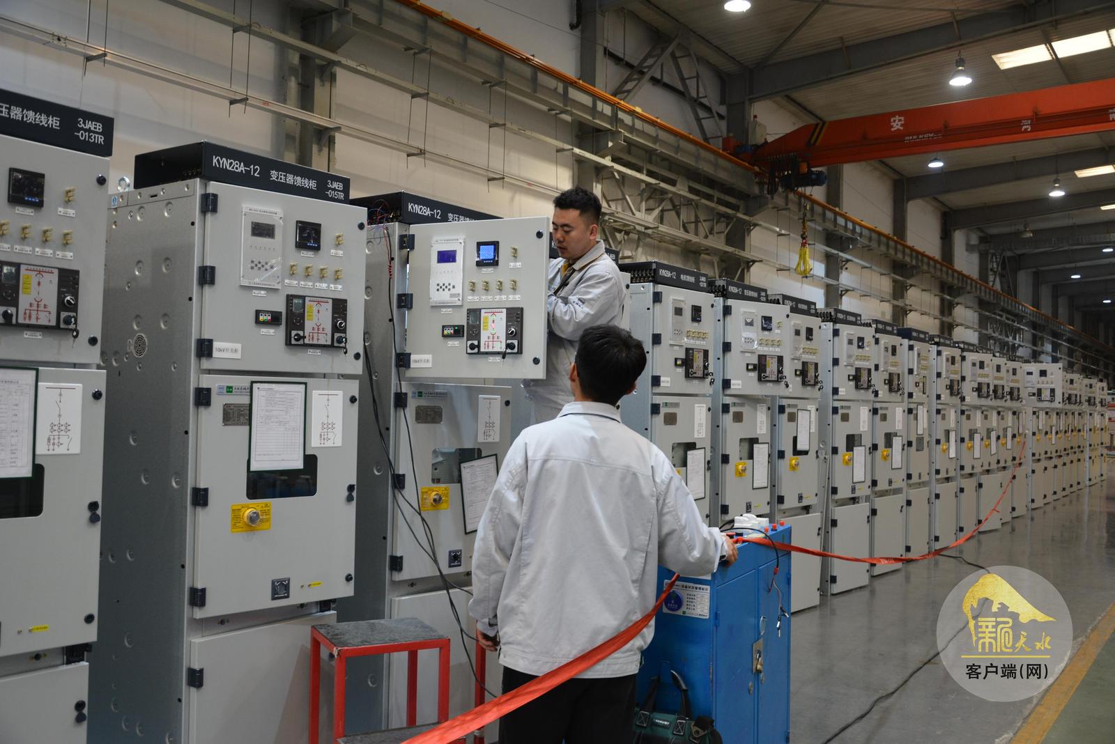 4月9日,在天水长城开关厂集团有限公司中压空气绝缘开关设备数字化车间(AIS)生产现场,员工严把质量关,对即将出厂交付的KYN28A—12型开关柜产品进行调试。