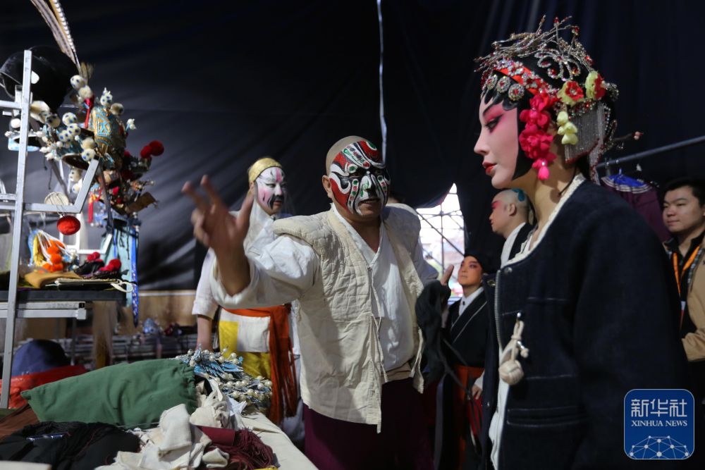 ↑ 4月12日晚,陕西省戏曲研究院的演员在甘肃省天水市伏羲广场进行演出前的准备。新华社发(王克贤 摄)