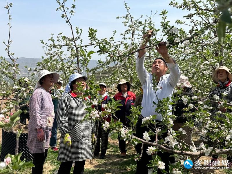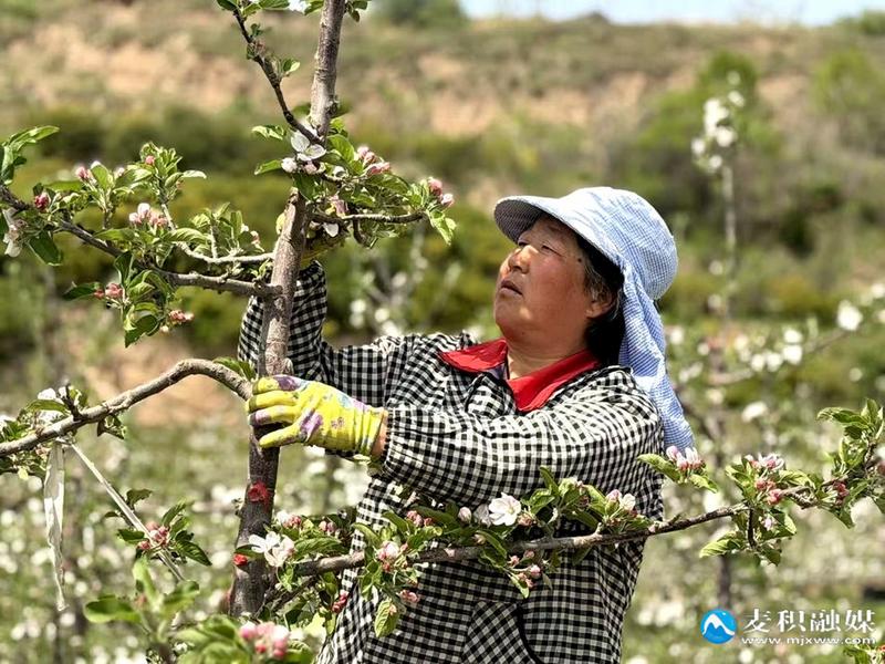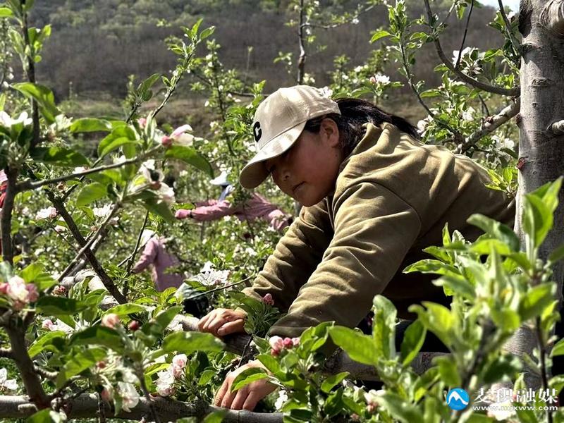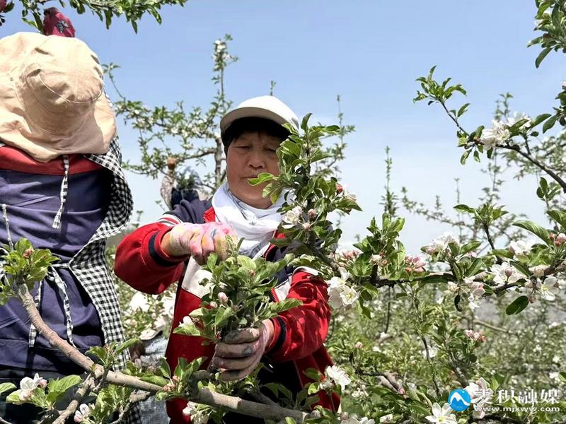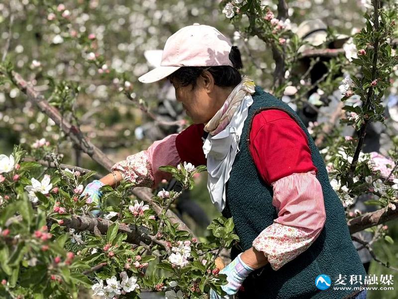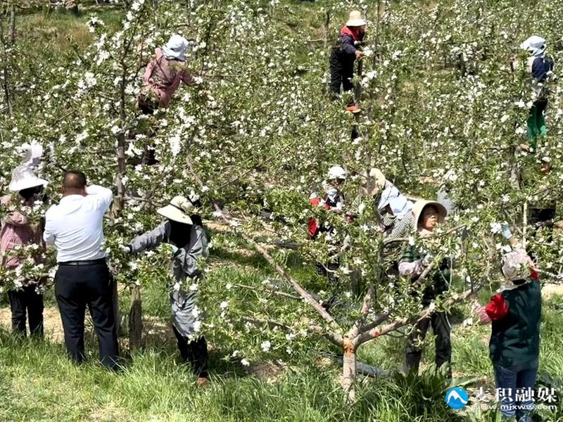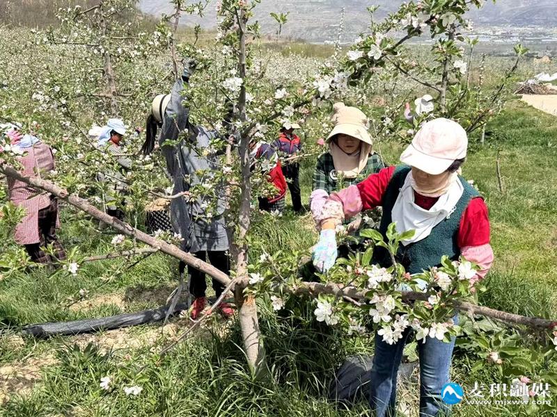 新天水讯 据麦积区融媒体中心消息 春日暖阳,繁花似锦。眼下,麦积区渭南镇的苹果园里迎来了一年中最关键的春管时节。在东丰源种植农民专业合作社的花牛苹果基地,上百亩苹果花竞相绽放,工人们正抢抓花期开展疏花作业,确保今年苹果丰产。