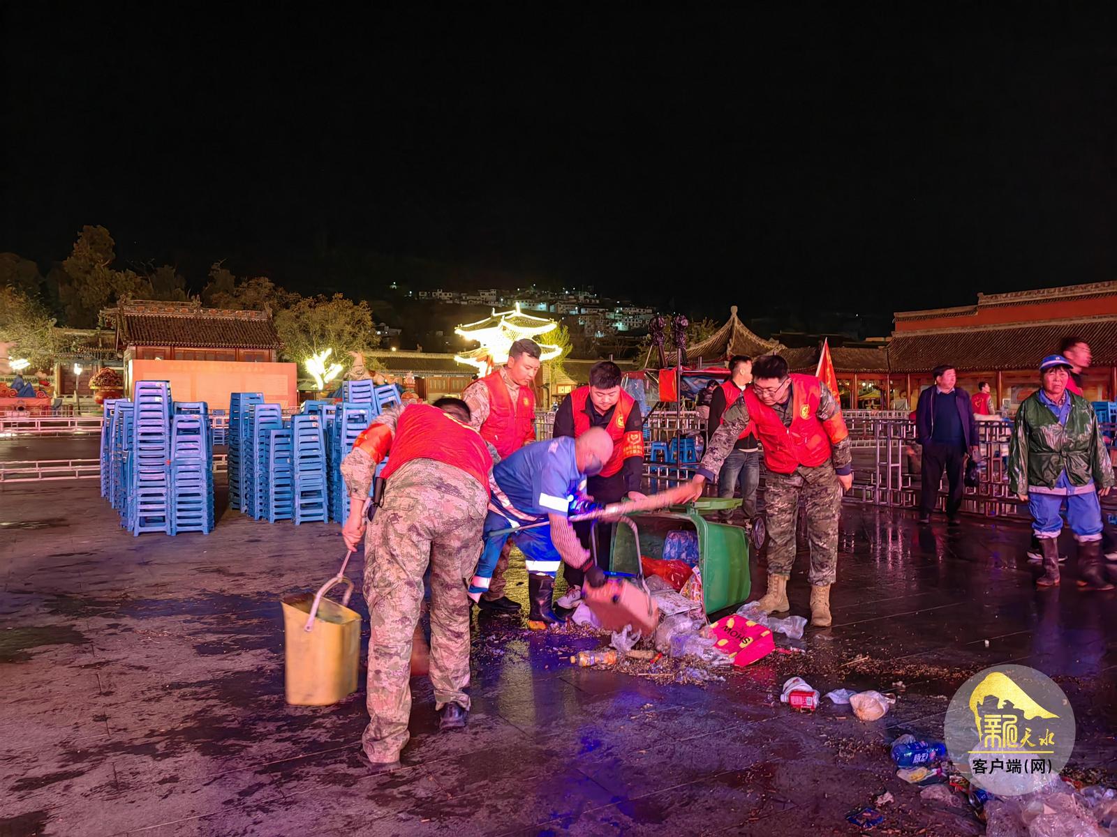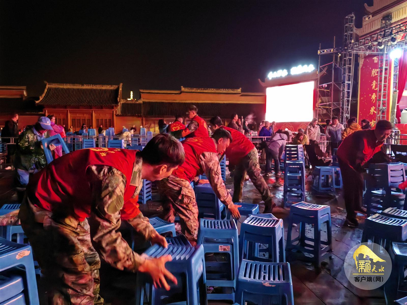 4月15日晚,记者在伏羲庙广场看到,退役军人志愿服务队的志愿者身着迷彩服,耐心引导观众有序入场,维护现场秩序,并细心提醒观众注意安全。志愿者积极为老年观众、特殊群体提供帮扶指引,主动解答观众咨询、提供贴心帮助。晚上11时许,演出结束后,志愿者与环卫工人一道,迅速收拢座椅,清理现场卫生,十几分钟的时间就将场地打扫得干净整洁。