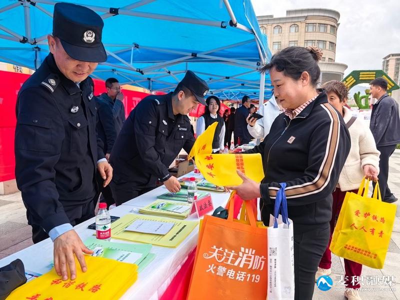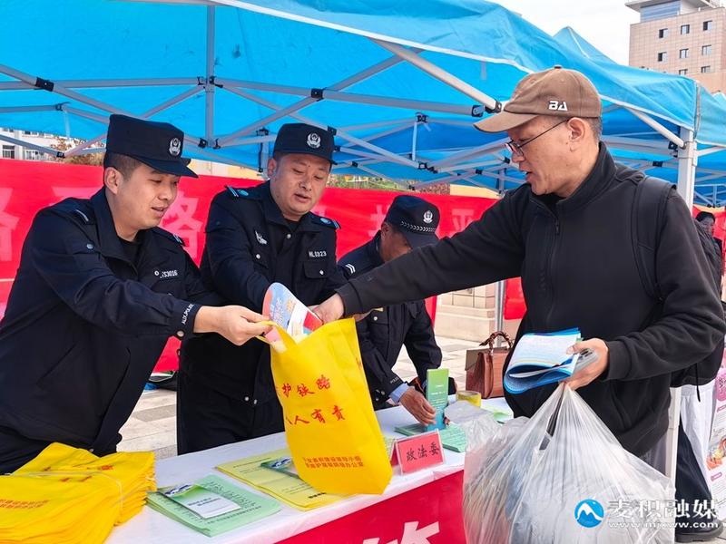 在麦积公安分局展台前,民警向群众讲解反电诈、反恐防暴、反邪教等安全常识,吸引了不少市民驻足聆听。“今天我们准备了关于国家政治安全保卫、反颠覆、反渗透、反邪教、反恐怖以及如何预防电信网络诈骗等类型的宣传册一千余份,希望通过宣传活动进一步提升大家的反诈意识和辨别能力,取得良好的普法效果。”麦积公安分局刑事侦查大队宣传员赵曼芹说。